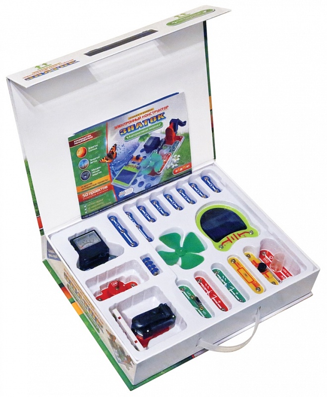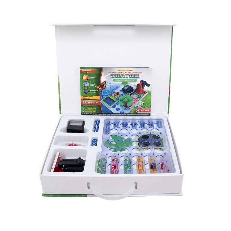 При желании, Вы можете сами придумать новые проекты и собрать их. Помимо этого в прилагаемой книге вы найдёте перечень и описание элементов конструктора. Все элементы данного конструктора совместимы с другими электронными конструкторами серии ЗНАТОК™ Рекомендуемый возраст: от 5 лет. Абсолютная безопасность и простота сборки – не надо паять! Охрана окружающей среды — это глобальная проблема, не имеющая границ и пересекающая все океаны! Для работы схем НЕ НУЖНЫ дополнительные источники питания – ни батарейки, ни аккумуляторы!
