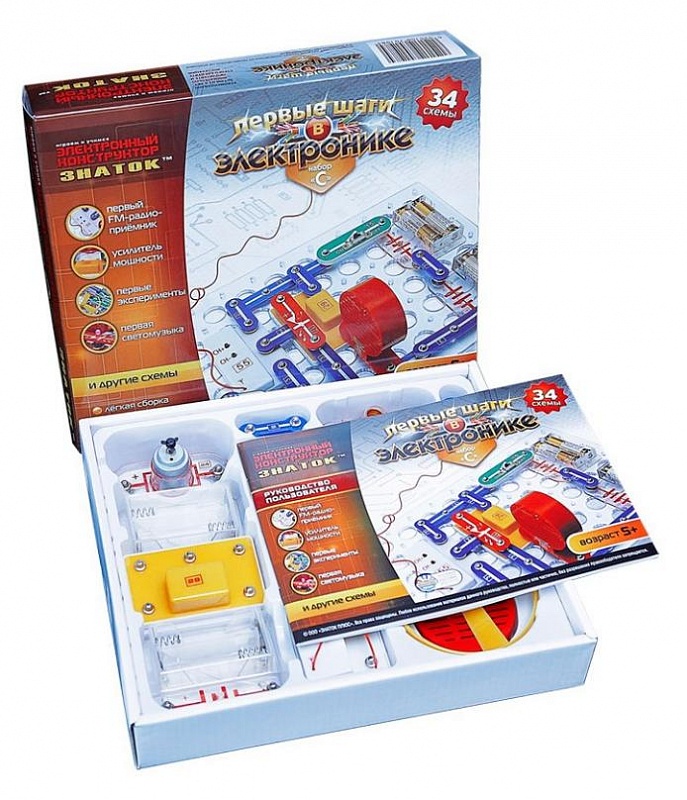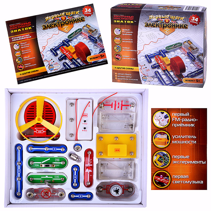 Вам будет предложено собрать свой первый FM-радиоприёмник, узнать, что такое усилитель мощности, познакомится со светомузыкой — всего 34 разных проекта, наглядно показывающих принципы работы простейших электронных устройств.