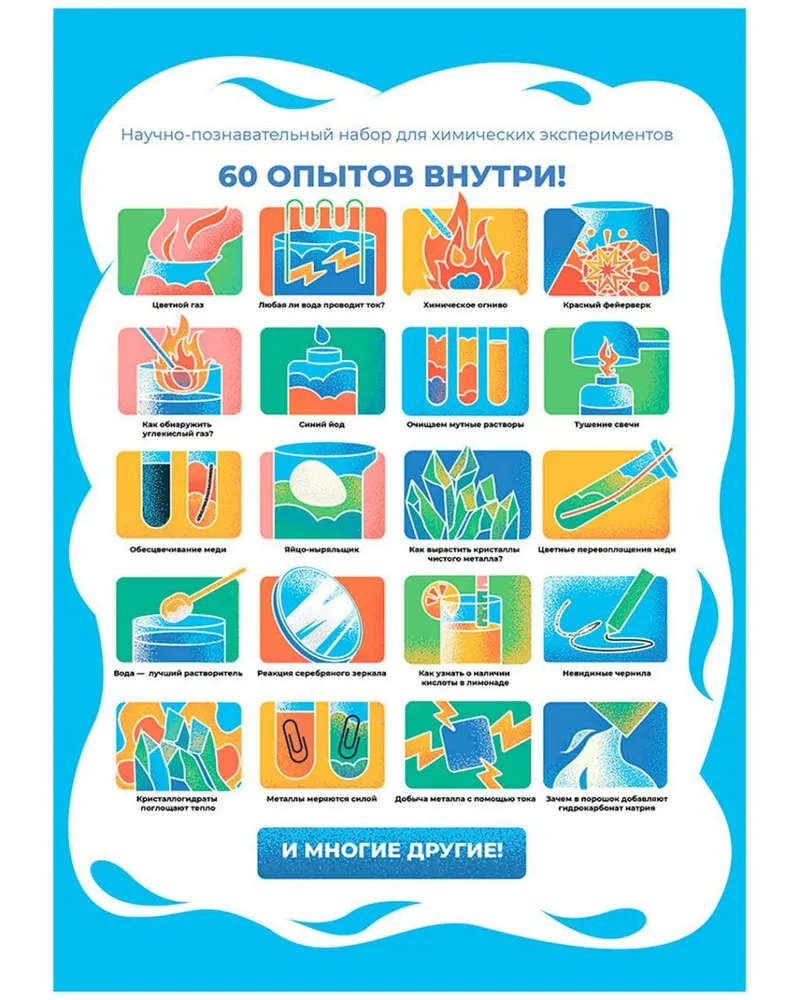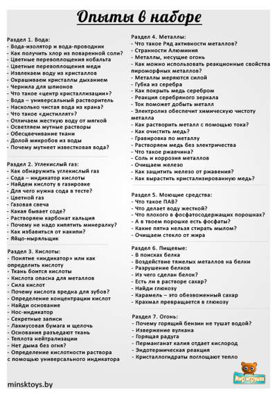 Получив в подарок такой замечательный набор для опытов, Ваш любознательный первооткрыватель проведет множество интересных опытов с огнем и водой, а также наглядно исследует свойства металлов. Научно-экспериментальный набор позволит юным исследователям провести абсолютно безопасные для здоровья химические реакции, эксперименты со смешиванием веществ и свойства жидкостей. Увлекательная серия опытов от Профессора Николя собрала лучшие опыты по химии, которые можно проводить в домашних условиях.