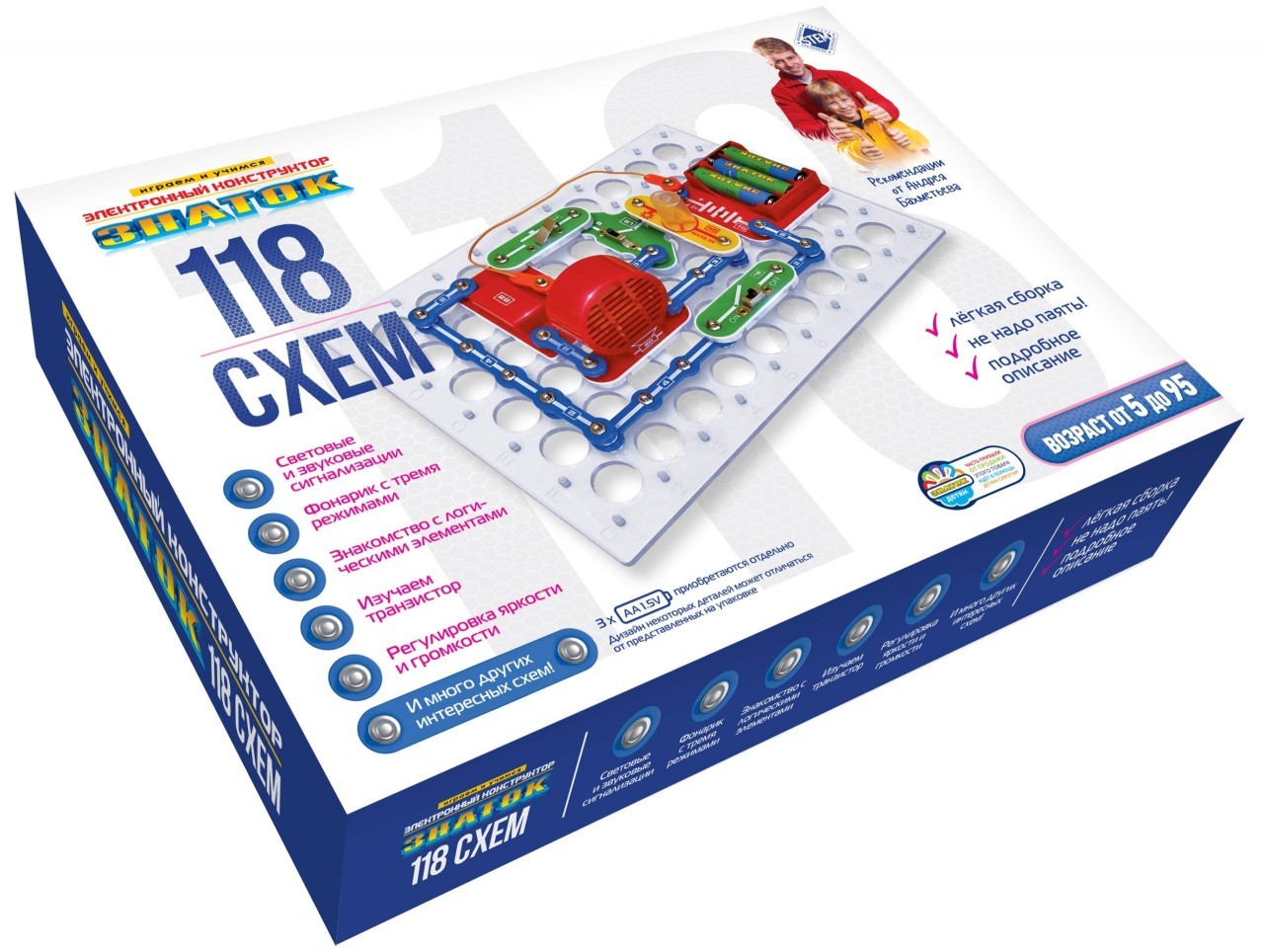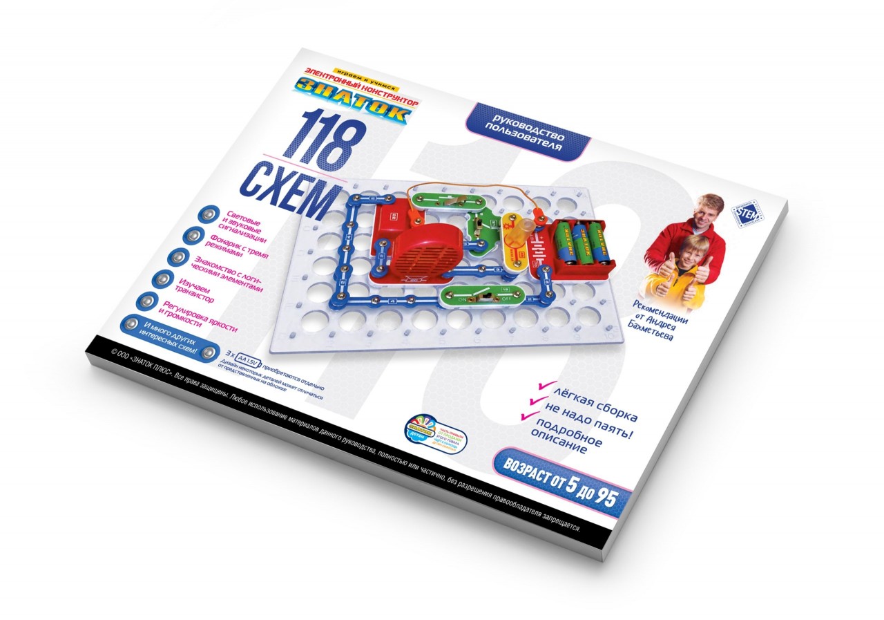 Абсолютная безопасность и простота сборки — не надо паять! Производитель рекомендует этот конструктор для детей 5-10 лет, но он рассчитан практически на любой возраст. Простота соединений и ясность описания позволяет собирать сложные схемы даже ребенку пяти лет, но даже умудренному в электронике человеку будет интересно собрать и опробовать схему, а затем воплотить ее в реальной жизни. Удовольствие получат не только дети, но и их родители!
