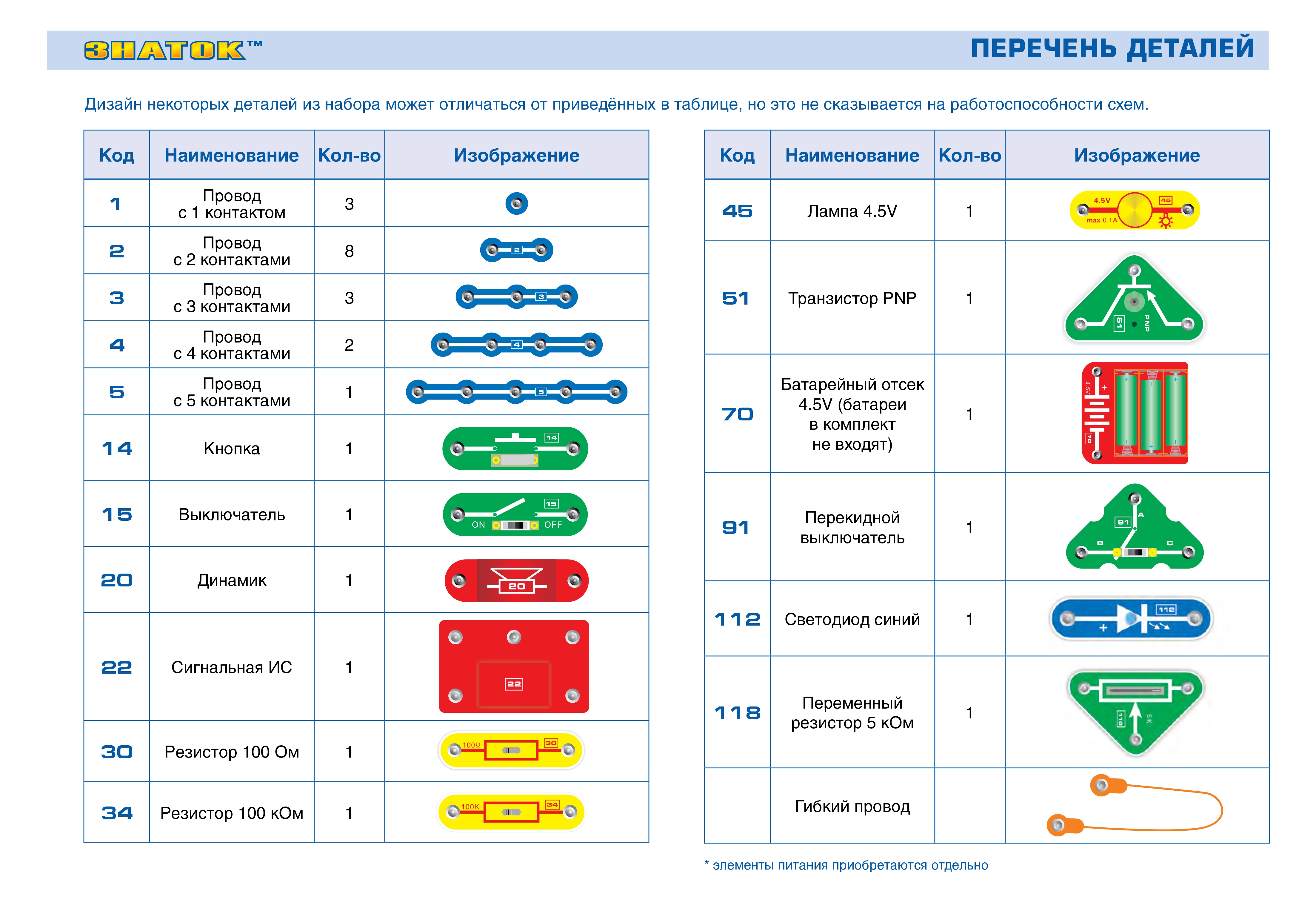 В комплекте «Руководство пользователя» Детали, необходимые для выполнения предложенных в руководстве проектов Руководство с описанием схем располагается в коробке под прозрачной монтажной платой. Нижняя часть коробки вместе с деталями и книгой запечатана в полиэтиленовую пленку.