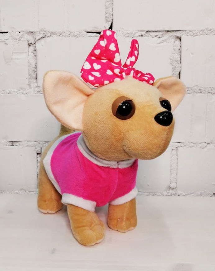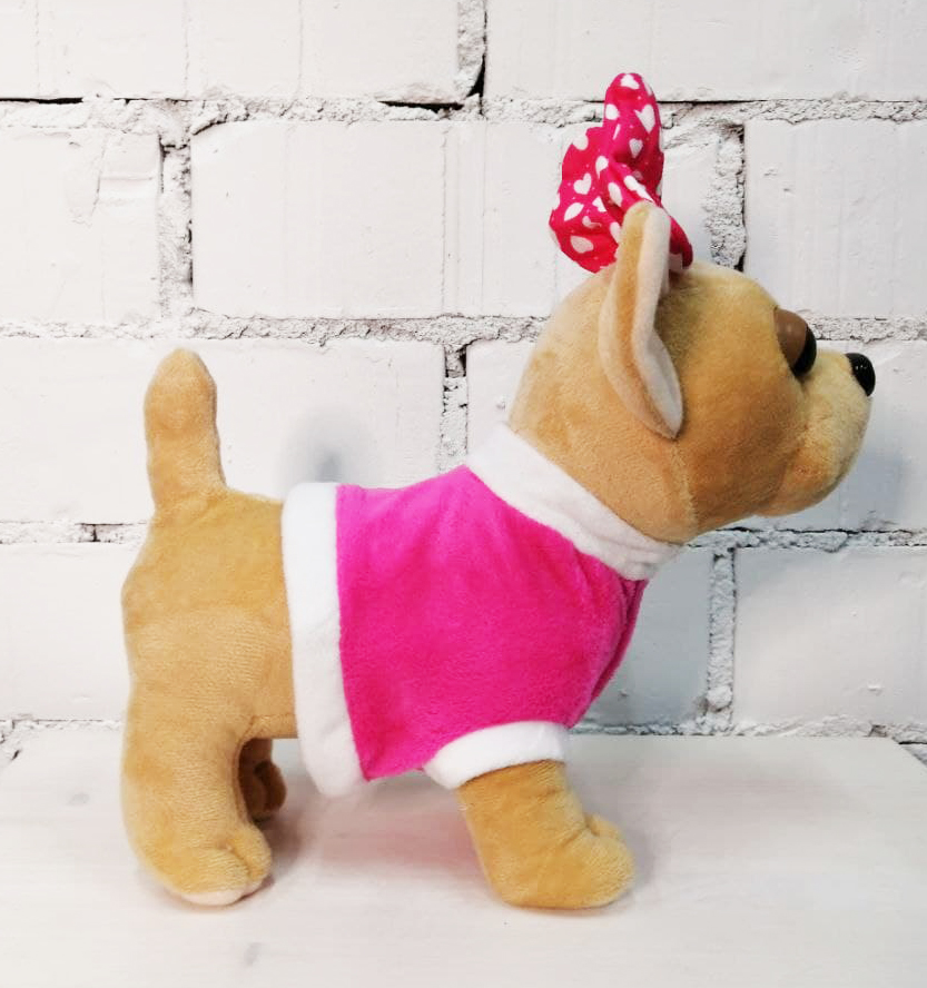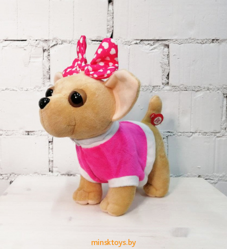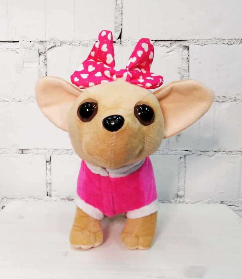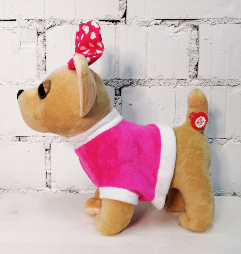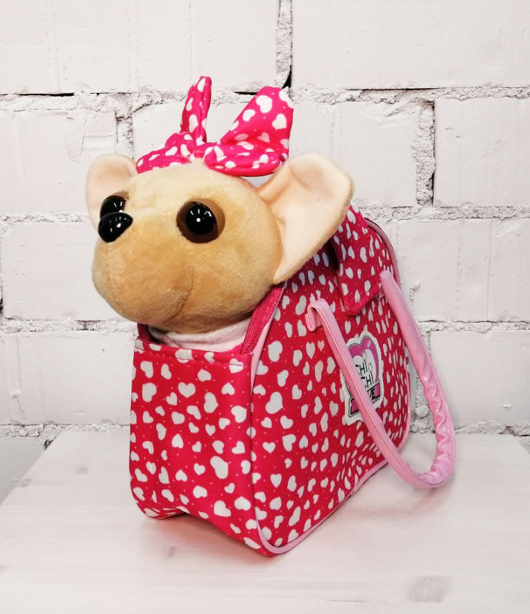 Очаровательная собачка порадует любого ребенка, станет любимым питомцем для него. Щенок очень приятный на ощупь. Умеет лаять и помещается в модной розовой сумочке.