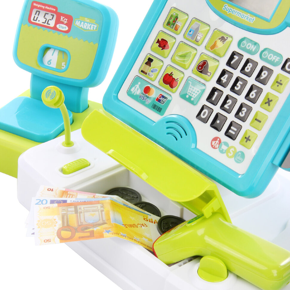 Функционал кассы: - при нажатии на кнопки издает писк; - проигрывает мелодию; - если провести картой по считывателю, издаст соответствующий звук; - отделение для денег открывается; - кассу можно использовать в качестве калькулятора; - при нажатии на кнопки с изображением продуктов на табло высветится их цена; - микрофон декоративный; - считыватель крутится на 360 градусов; - у весов можно менять числовые показания, прокручивая колесико в верхней части, поле, где взвешивают продукты, прогибается.