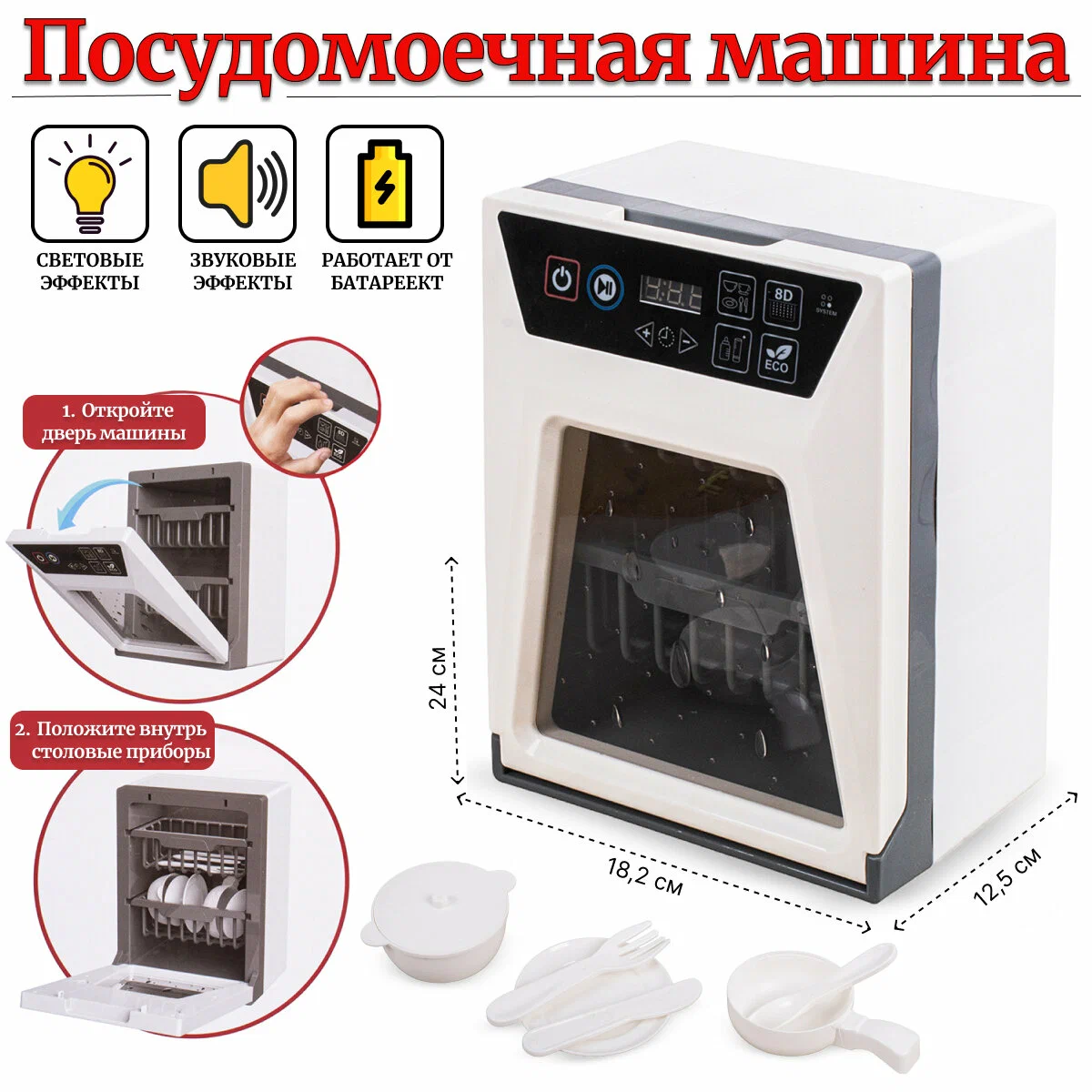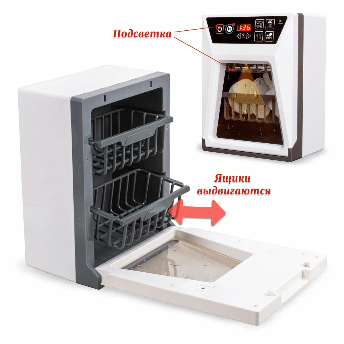 - Функции: имитация работы посудомоечной машины, звуковые эффекты, подсветка, регулировка времени работы