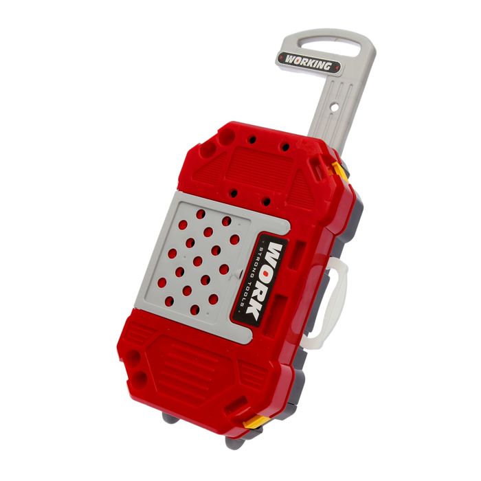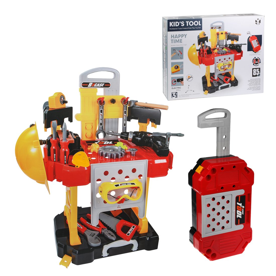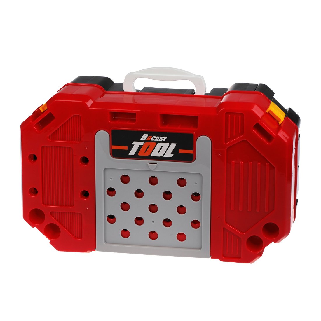 В комплекте 86 элементов: электродрель (работает от 2-х батареек типа АА, не входят в комплект) чемоданчик и детали для его трансформации в столик пила отвертки (2 шт) насадки (3 шт) молоток каска защитные очки гаечные ключи разводной ключ плоскогубцы струбцина сантиметр маска детали имитирующие древесину дюбеля крючки шестеренки гайки болты декоративные наклейки Детский набор инструментов изготовлен из безопасного и нетоксичного пластика.