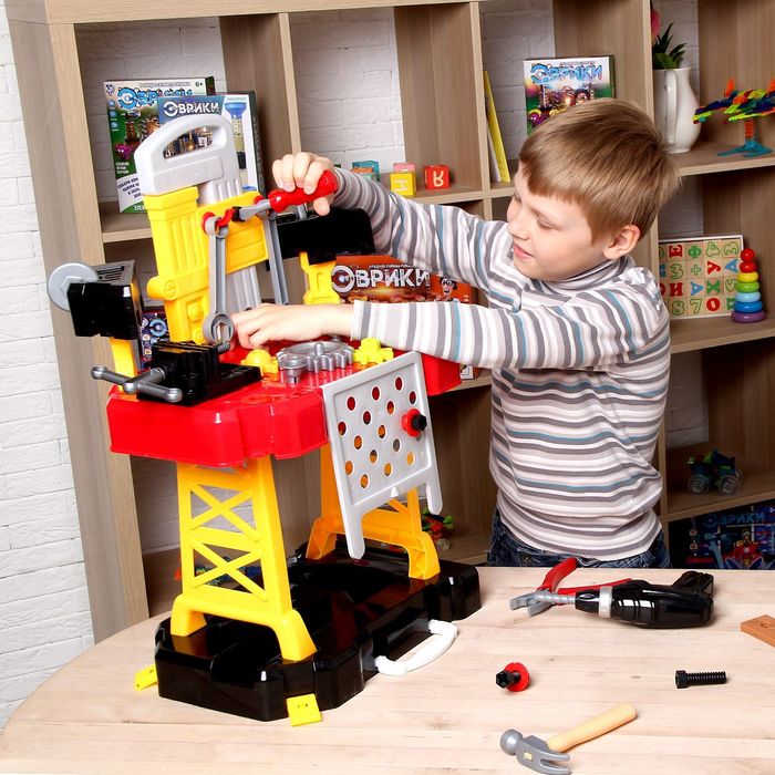 Основной элемент этого набора – верстак с различными принадлежностями. Игра с таким набором прививает очень полезные навыки, которые необходимы каждому мужчине. Особенно интересной игру сделает электродрель, у которой вращается сверло, причём есть переключатель вращения сверла по часовой и против часовой стрелки!