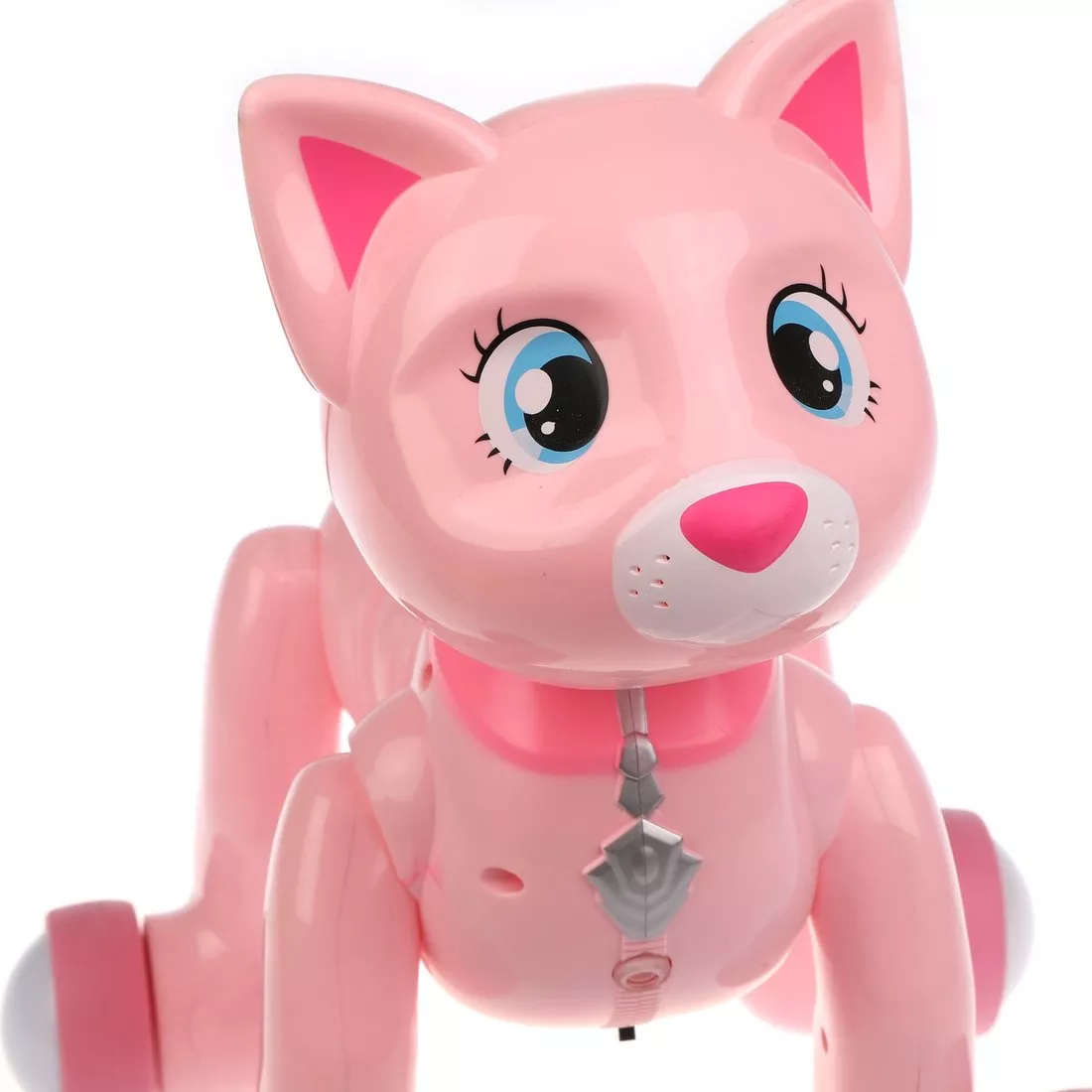 Очаровательная игрушка на радиоуправлении «Кошка» приведёт ребёнка в полный восторг! Играть с ней очень весело и интересно. Кошечка с розовым окрасом умеет двигаться вперёд и назад, поворачивать вправо и влево. Команды задаются игрушке нажатием кнопок с соответствующими стрелочками на пульте управления. Во время движения кошка реалистично мяукает. На груди у неё имеется световой проектор. В голове у кошечки расположен сенсорный датчик. Если поднести ладонь ко лбу кошки, она промяукает, шустро двигаясь вперёд.