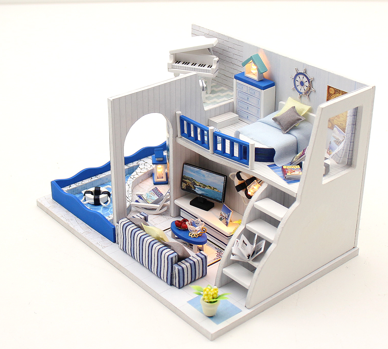 Интерьерный конструктор "Морской бриз" - конструктор-миниатюра домика на побережье с небольшим бассейном и белоснежным роялем! Бело-синий интерьер румбокса во время сборки позволяет полностью окунуться в атмосферу средиземноморского берега и напомнит о приятных солнечных днях волшебного отпуска и навеет фантазии о том, как можно беззаботно валяться на втором этаже своего дома на берегу моря на кровати в форме лодочки и наслаждаться морским бризом! Натуральные материалы для сборки - дерево, бумага, ткани. В комплект входит: все необходимые для создания миниатюры детали, светодиоды, инструменты для сборки, подробная инструкция на русском языке.