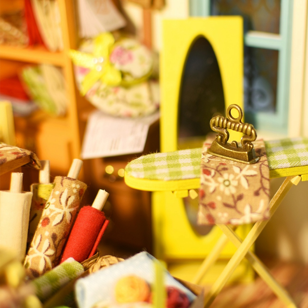 Интерьерный конструктор (румбокс) DIY House «Lisa’s tailor» (Швейная мастерская) для моделирования миниатюрной комнаты в трехмерном пространстве от производителя Robotime. Каждый элемент собирается из деревянных и бумажных составляющих. Причем вы можете даже провести самостоятельно проводку к светильникам и другим предметам. Румбокс «Швейная мастерская» — идеальное место для ателье одежды и создания своей коллекции..