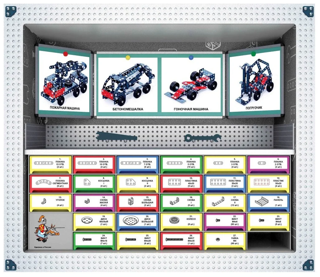 Металлический конструктор № 4 от компании "Десятое королевство" состоит из 294 элементов. Он позволит ребенку собрать несколько различных транспортных средств: пожарную машину, бетономешалку, спортивный автомобиль и погрузчик. В наборе есть специальная инструкция, так что ребенок без труда справится со сборкой. Все детали сделаны из металла, они приятны на ощупь и имеют красочное покрытие. Сборка конструктора отлично развивает инженерное мышление, логику ребенка и его воображение. Конструктор отлично подойдет для уроков труда в школе. Серия "Школьный" идет на смену своим предшественникам, выгодно отличаясь цветным дизайном, функциональностью собираемых моделей.
