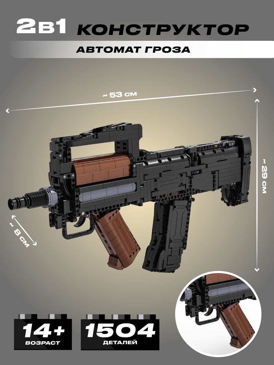 Конструктор «Автомат Гроза» состоит из 1504 деталей, что обеспечит вашему ребенку многочасовое увлекательное занятие. Сборка модели подходит для детей от 8 лет и старше, а удобная инструкция делает процесс легким и понятным. Каждая деталь идеально подогнана друг к другу, что гарантирует высокое качество и прочность собранной модели. Ваш маленький инженер сможет с легкостью создать великолепную копию знаменитого российского оружия, а подвижные элементы позволят ему проверить работоспособность своего творения.