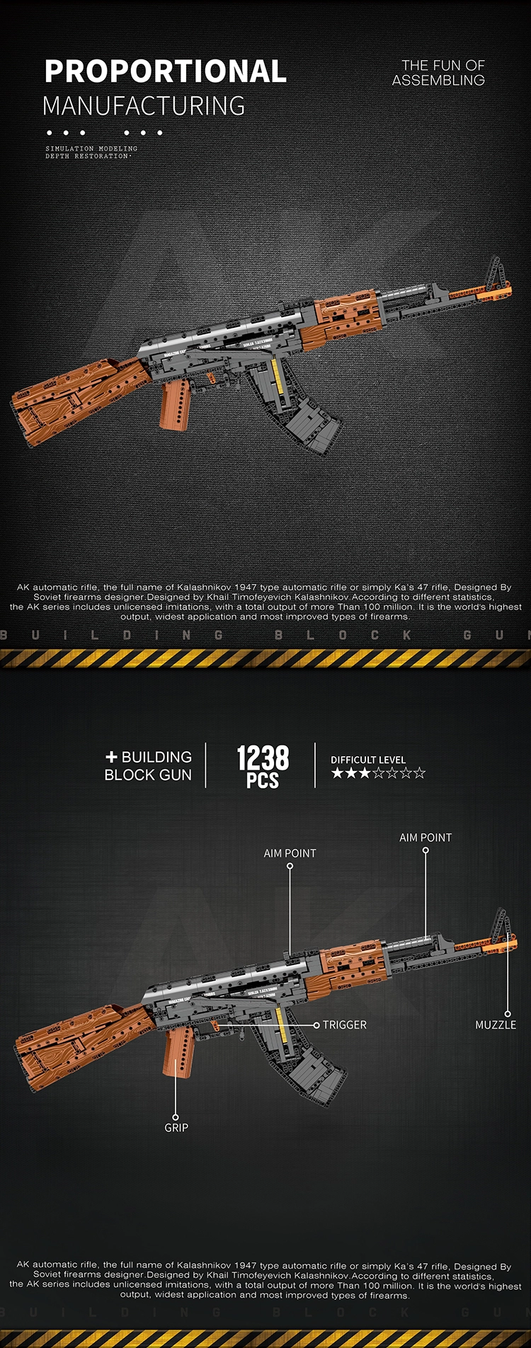 Идентична игрушка своему реальному прототипу и по двухцветной окраске корпуса и отдельных элементов. По всему видно, что из деталей этого набора создается копия так называемой деревянной версии АК-47, который был принят на вооружение в Советской армии в 1949 году.