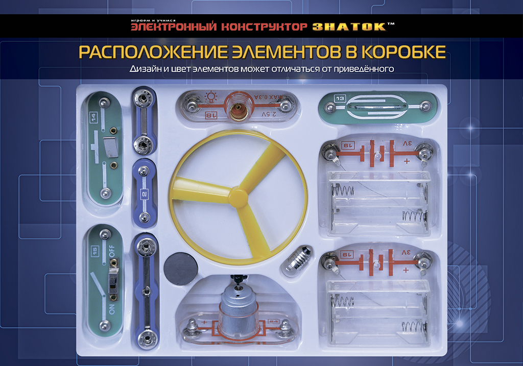 Провода с 2 и 3 клеммами; Геркон; Кнопка; Выключатель; Патрон для лампы на 2,5 V; Батарейные отсеки; Электродвигатель; Пропеллер; Магнит; Лампа на 2,5 V; Монтажная плата; Инструкция по применению |