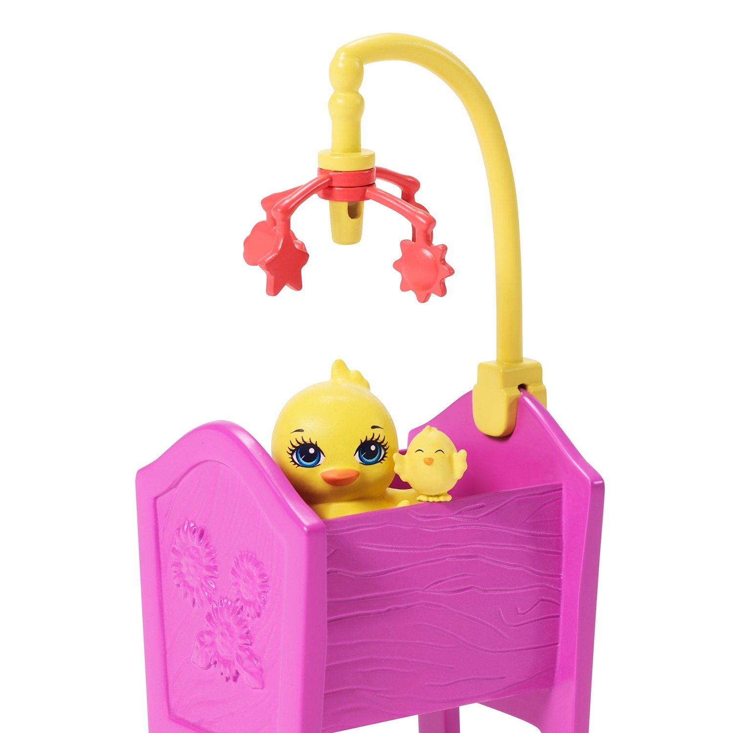 - 1 игровой набор, 1 кукла, 4 фигурки питомцев, 1 кроватка, 1 колыбелька, 3 бутылочки, 1 подгузник, 1 нагрудник, 1 гнездо, 3 яйца