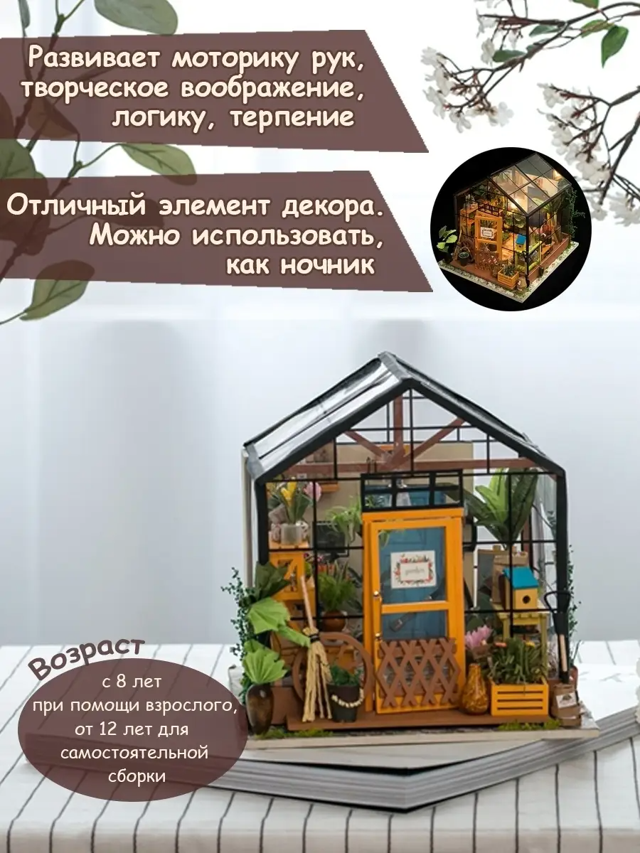 Румбокс – вариация массового увлечения, существовавшего много веков назад. Сегодня интерьерные конструкторы невероятно популярны в Европе и с недавних пор завоевывают любовь юных и взрослых россиян. В нашем магазине вы можете найти разные сборные модели для вашего творчества: Зимний сад, Цветочный рай и механический глобус. Румбокс (Roombox) Зимний сад — это сборная модель конструктор с подсветкой, который в мельчайших деталях повторяет дизайн цветочной оранжереи. Домик декоративный включает в себя миниатюрные деревянные предметы интерьера, мебель, растения и другие маленькие детали из натуральных материалов: дерева, бумаги, мягкой ткани, а также канцелярия: клей, кисточка, металлический пинцет, необходимые для сборки. Игровой комплект можно использовать в качестве ночника, благодаря светодиодному освещению - светильникам и лампам, и прозрачному каркасу, который не мешает насладиться результатом совместного творчества всей семьи. Сборная модель дома может использоваться как декор интерьера или как игрушка, для развивающих игр с детьми, мальчиками, а также девочками в куклы барби. Румбокс – альтернатива кукольному дому, благодаря которой осуществить заветную мечту совсем несложно. Декоративный дом сборная модель сочетает много важных функций, но его основная цель – развитие творческих способностей взрослого или ребенка, релаксация, возможность погрузиться в сказочный мир миниатюры, вернуться в прошлое, заглянуть в будущее. Аксессуары для домашнего комплекса разложены по пакетам и упакованы в красивую картонную коробку, поэтому развивающая игрушка DIY House подойдет в качестве подарка родным и близким, детям и взрослым по любому поводу и без него!