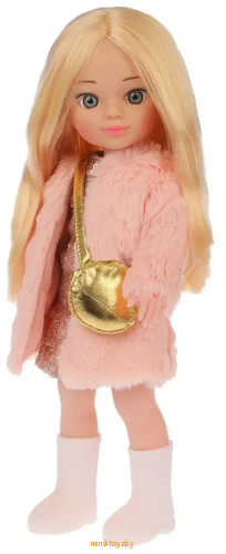 Кукла одета в роскошное платье, расшитое золотыми пайетками, белые высокие сапожки и стильную шубку из нежно-розового искусственного меха. В комплекте прилагаются модные золотистые туфельки и сумочка через плечо.