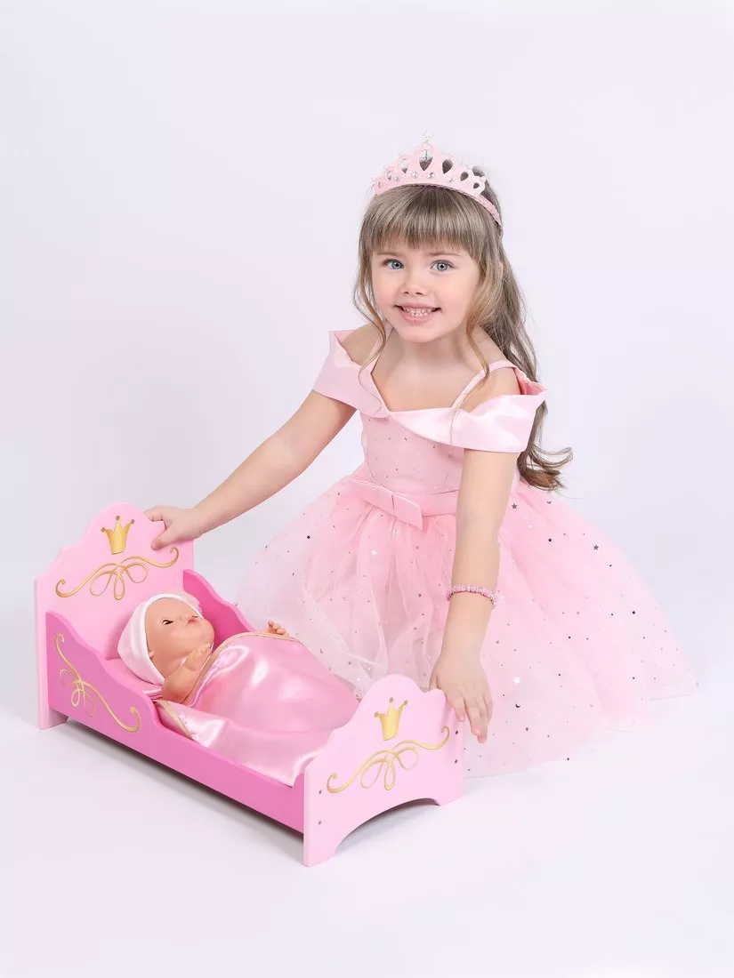 Кроватка из коллекции «Принцесса» подходит для кукол и других игрушек высотой до 45 см. Вместе с кроваткой прилагается комплект атласного постельного белья: матрас, подушка и одеяло, выполненные в оттенках розового цвета – популярного и любимого среди девочек.