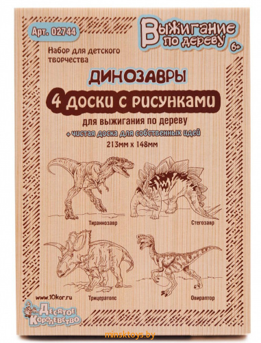 Мир динозавров всегда притягивает к себе внимание, поэтому в «Десятом королевстве» создали отдельный набор дощечек с рисунками для выжигания и назвали его «Тираннозавр, Трицератопс, Стегозавр, Овираптор».