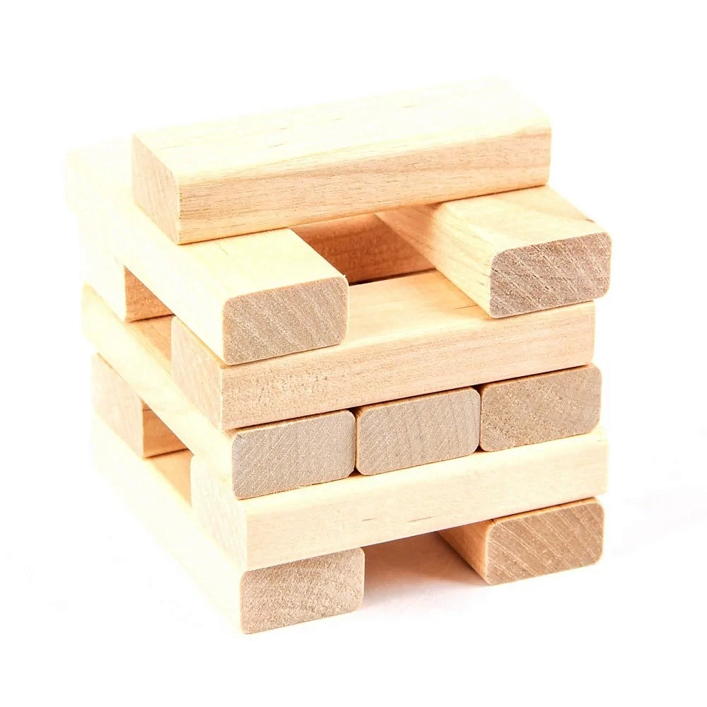 Из брусков надо сложить ровную башню, используя специальный уголок, входящий в комплект игры. В каждом ряду должно быть три бруска, каждый последующий ряд складывается в направлении, поперечном предыдущему. Таких рядов должно получиться 18!