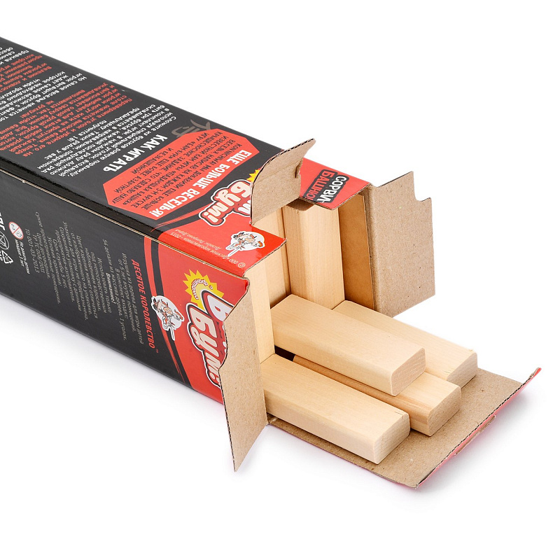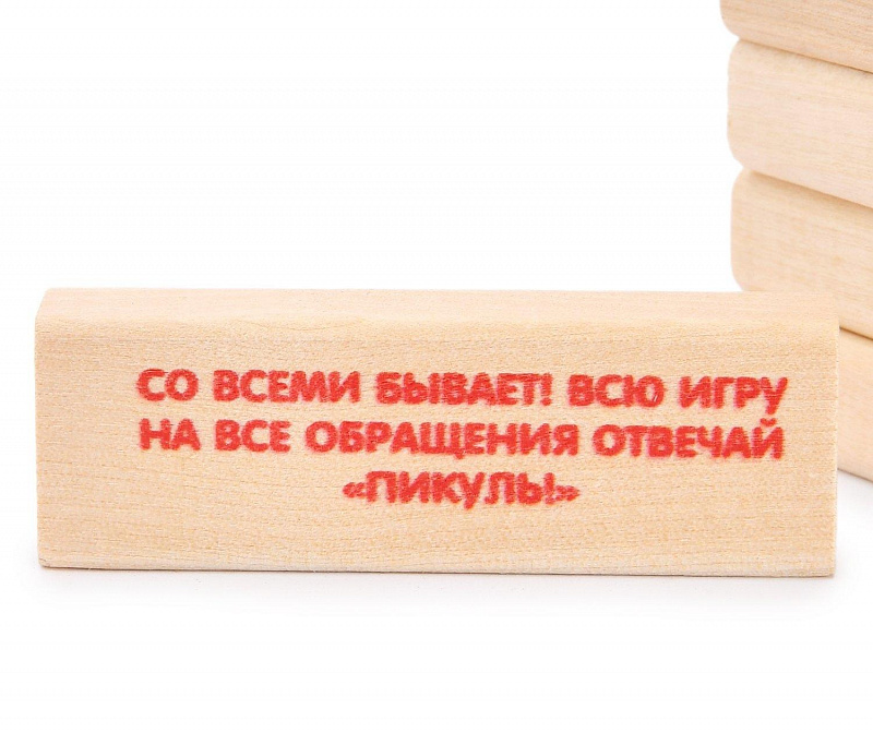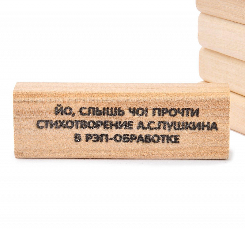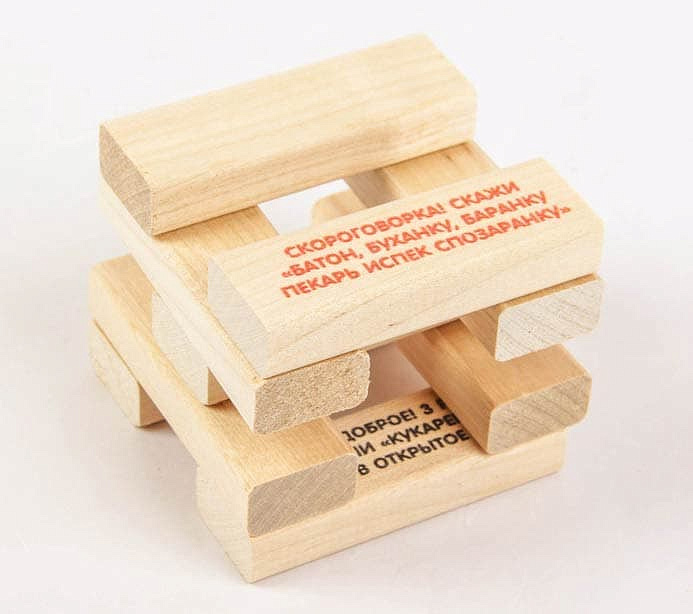 - Задания (фанты) нанесены на бруски специальной краской, никакие пленки наклеивать не надо, открываем коробку и играем.