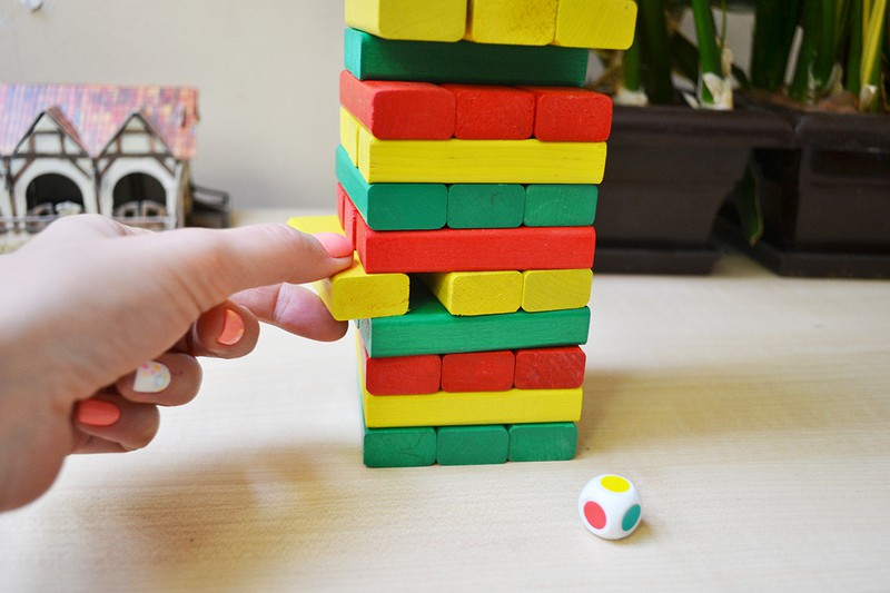 Можно начинать игру. Установив очередность, игроки по очереди бросают кубик, который определяет цвет бруска, который он должен переместить. При этом игрок самостоятельно выбирает для атаки любой уровень и вытаскивает одной рукой один из брусков. Этот брусок, оказавшийся в руках игрока, укладывается на новый, верхний, этаж сооружения. Везение и ловкость помогут выстроить игрокам башню вдвое большей высоты. Виновник разрушения необыкновенного цветного сооружения считается проигравшим!
