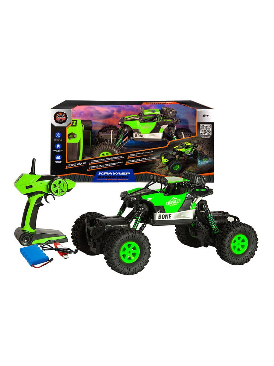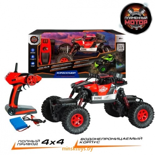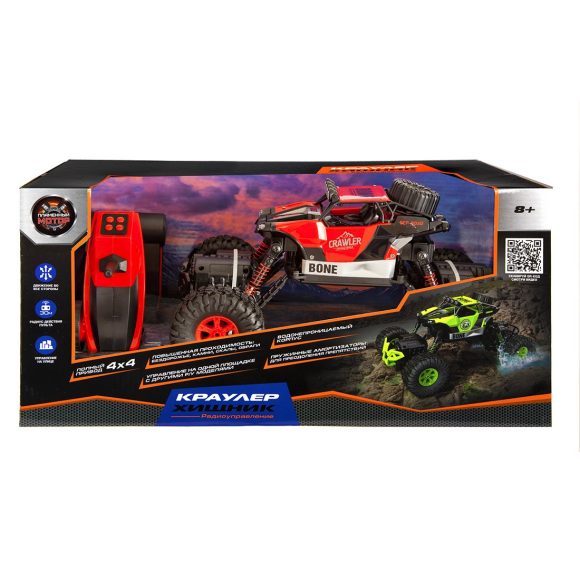 Машина с радиоуправлением, полный привод 4х4 WD, развивает скорость 10 км/ч и может двигаться во всех направлениях, а также по пересеченной местности: по грунту, песку, траве, камням, скалам, оврагам, воде.