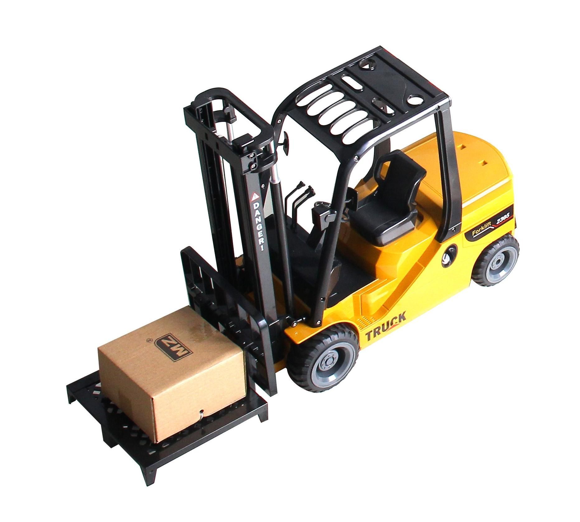 Радиоуправляемый вилочный погрузчик MZ 2305 выглядит, как реальная техника для транспортировки различных тяжелых предметов. Он может поднимать объекты, транспортировать их в различные места и поднимать их с помощью лифтового механизма. Модель погрузчика высоко детализированная и способна имитировать звуки за счет встроенных динамиков внутри.