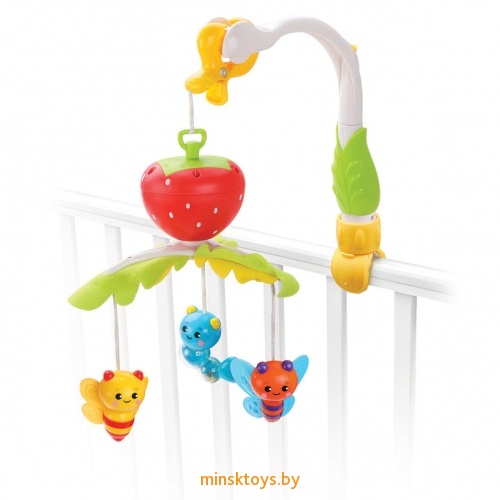 Милый музыкальный мобиль "Клубничка" можно установить на детскую кроватку при помощи надёжного крепления, а можно взять его собой на прогулку или в путешествие, используя в качестве подвески. Забавные игрушки будут вращаться по кругу под приятную музыку, словно карусели. Наблюдая за ними, малыш научится фокусировать взгляд на объекте и распознавать цвета. Мобиль воспроизводит спокойные мелодии и звуки природы. Уровень громкости регулируется. Игрушка работает от 3-х батареек типа АА на 1,5 V (входят в комплект). Длина дуги составляет 33 см. Изделие изготовлено из пластмассы.