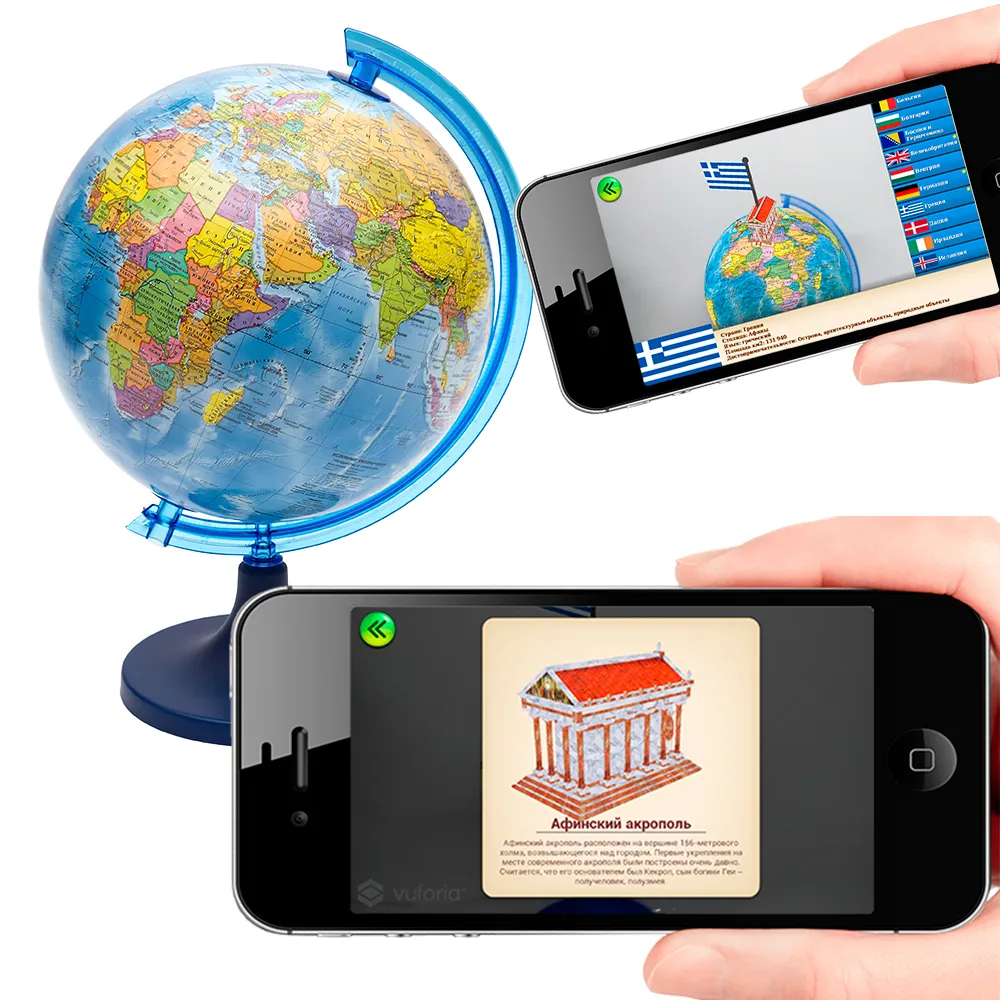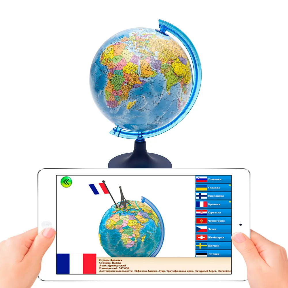 Наиболее известные достопримечательности представлены в виде объемных моделей 3D, с которыми Вы сможете взаимодействовать. В приложении предлагается раздел "Викторина", который поможет детям лучше запомнить полученную информацию. Инструкцию по установке и пользованию приложением Вы найдете внутри упаковки. Глобус выполнен по классической технологии имеет надежную оснастку.