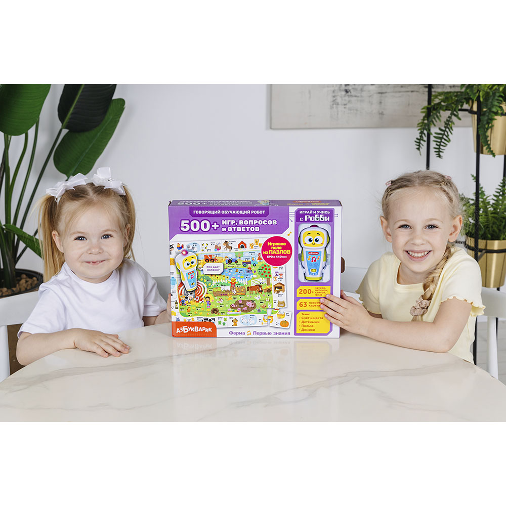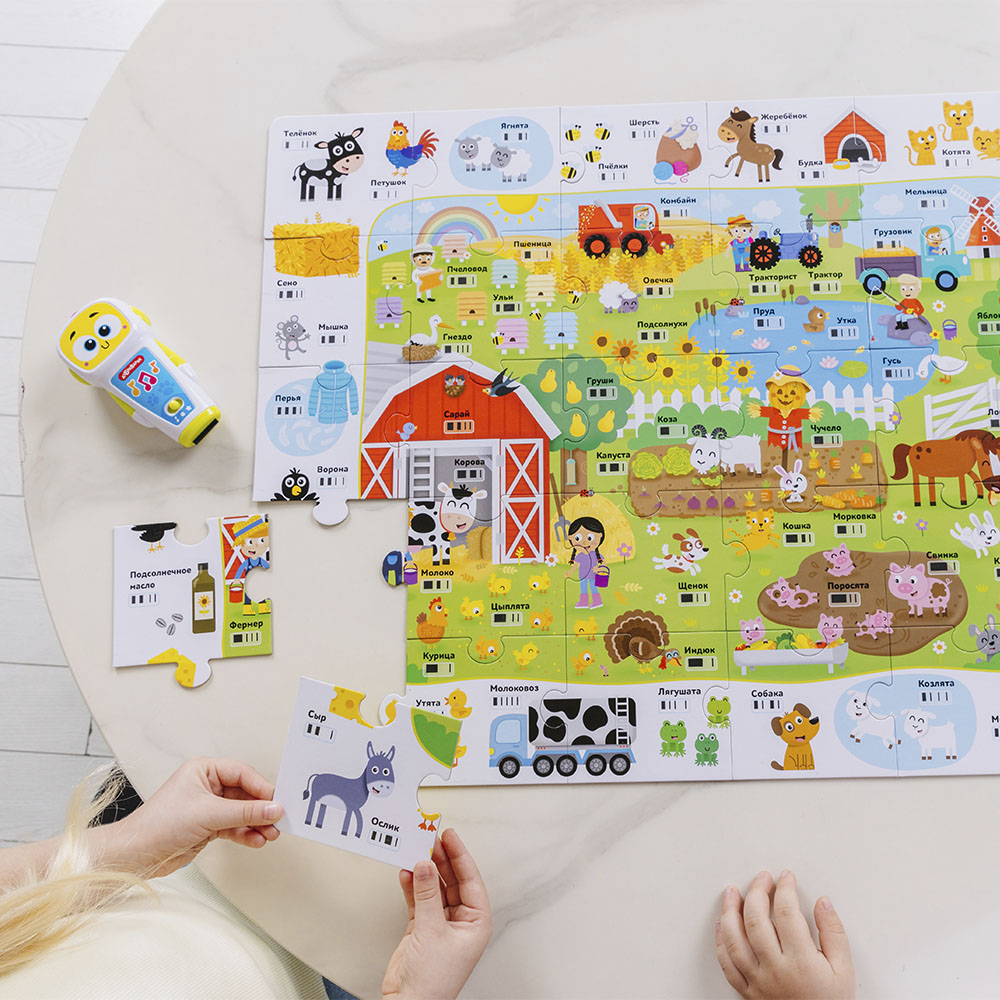 В игровом наборе «Ферма Первые знания» ребенок найдет говорящего робота со сканером штрихкодов и пазл из 30 элементов.