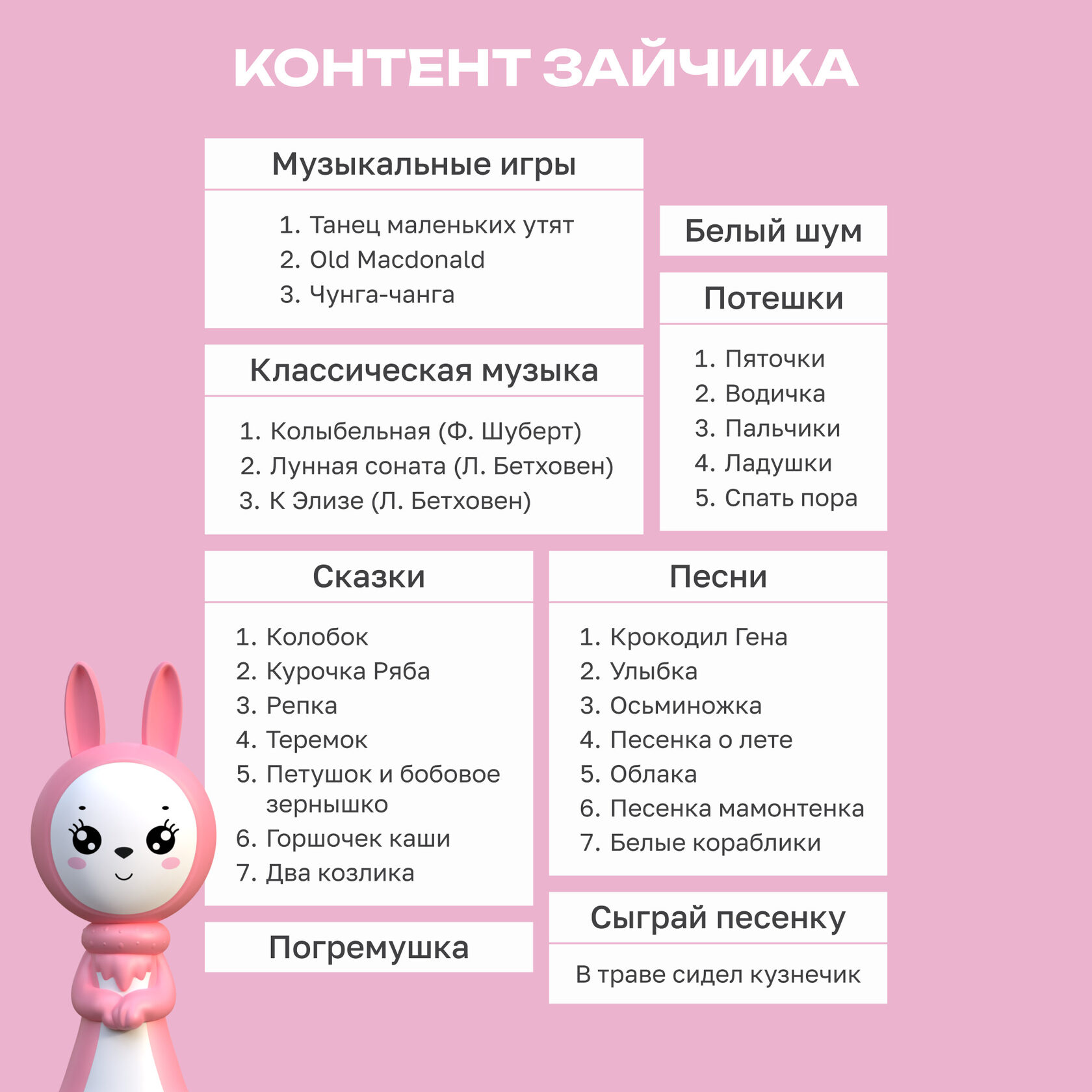 Эта интерактивная игрушка создана специально для самых маленьких – мальчиков и девочек с первых дней жизни. Зайчик Няня Грызушка способствует раннему развитию и запуску речи, становясь первым верным другом ребенка и надежным помощником для родителей.