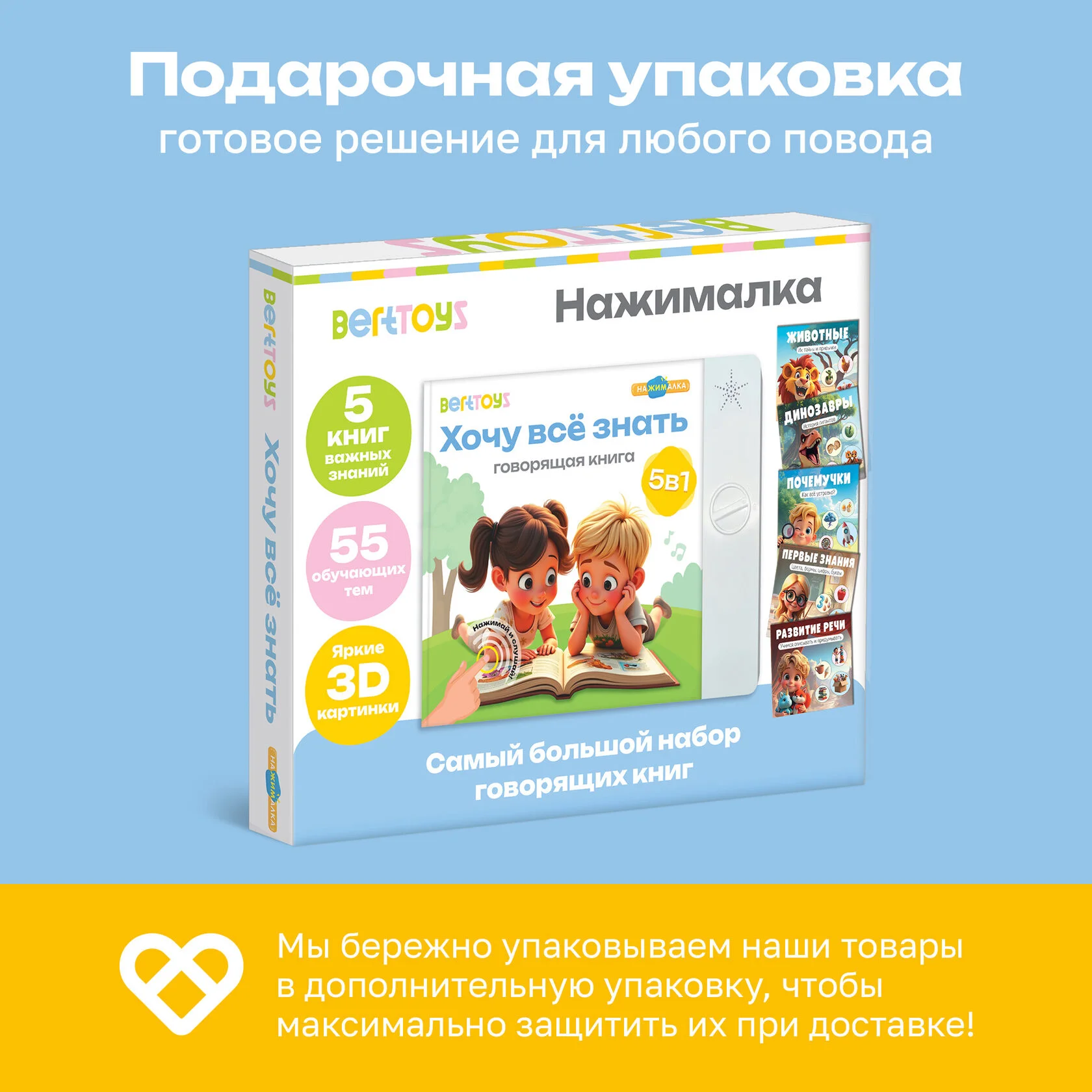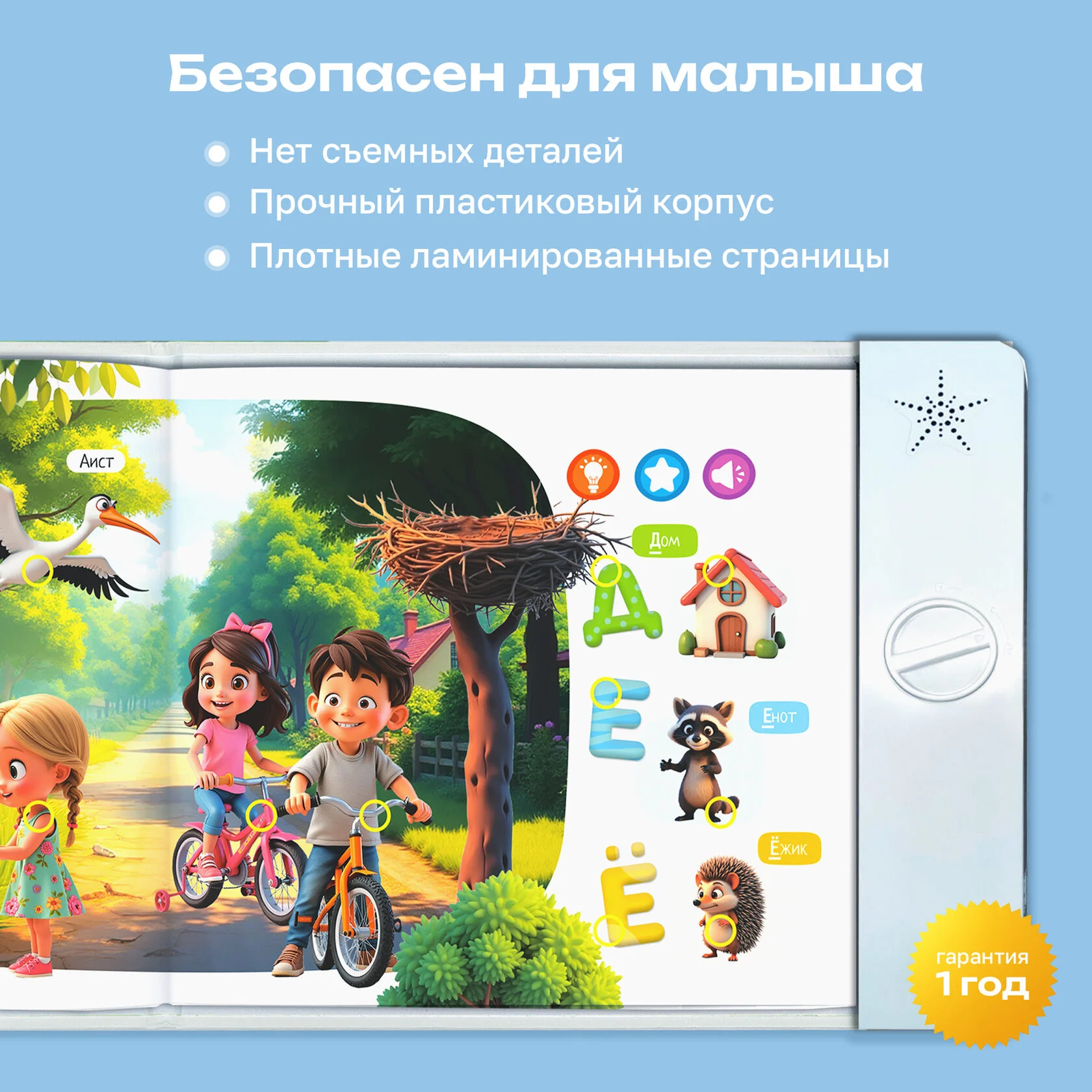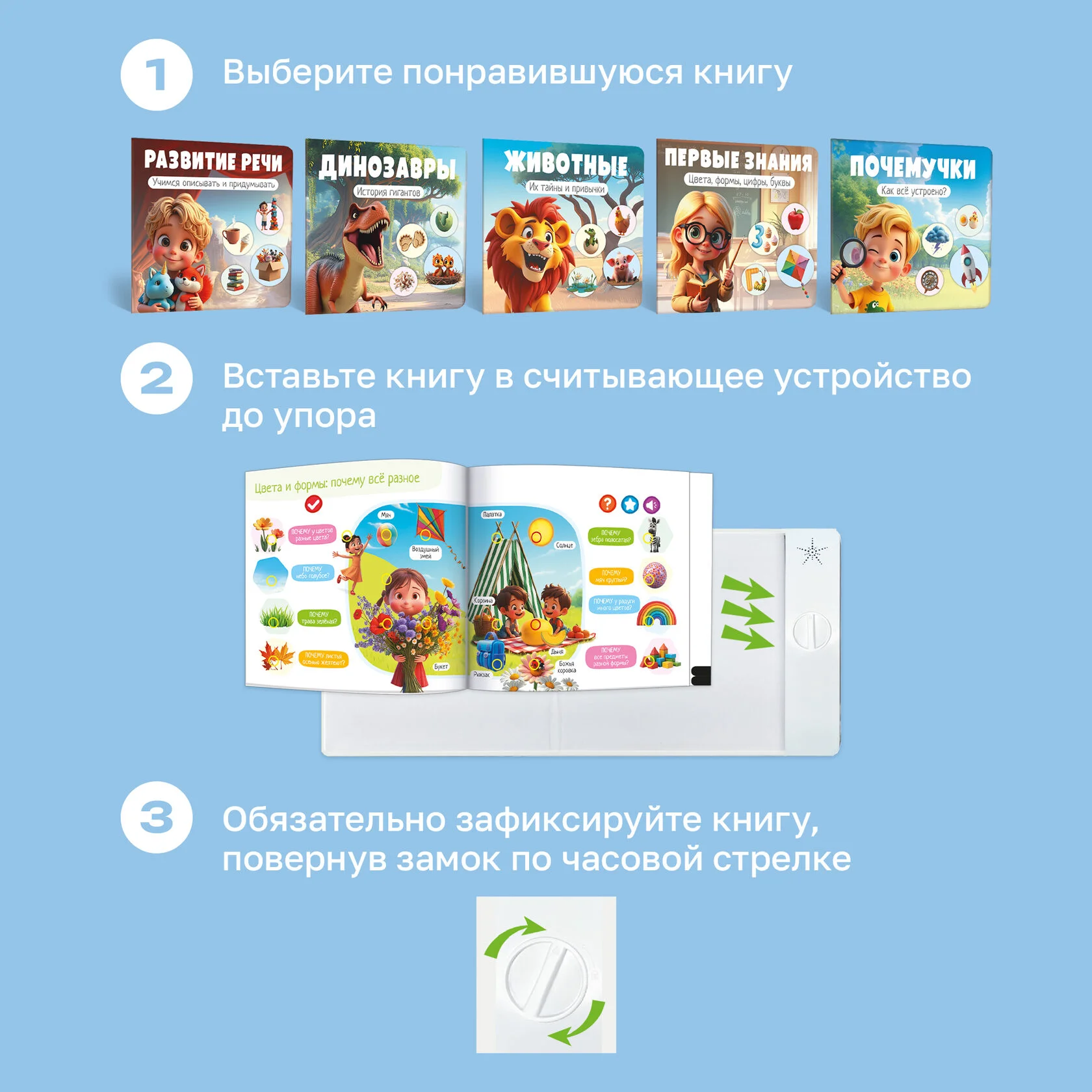 «Почемучки», «Динозавры», «Животные», «Первые знания» и «Развитие речи» – более 2500 звуков, фраз, вопросов и 55 обучающих тем! Для каждой тематики предусмотрен свой уникальный режим, который поможет малышу запомнить новые названия, развивать внимание, усидчивость и связную речь.