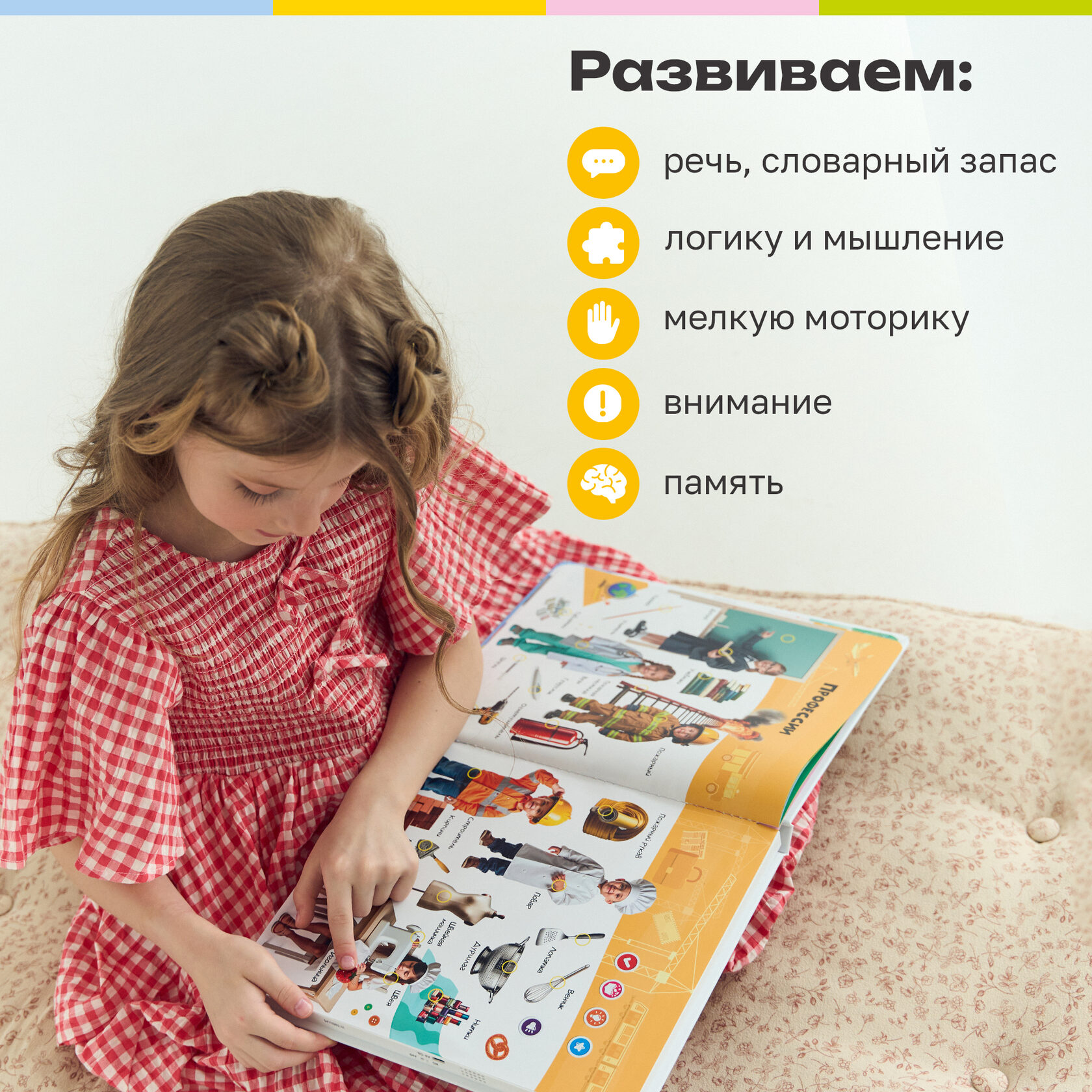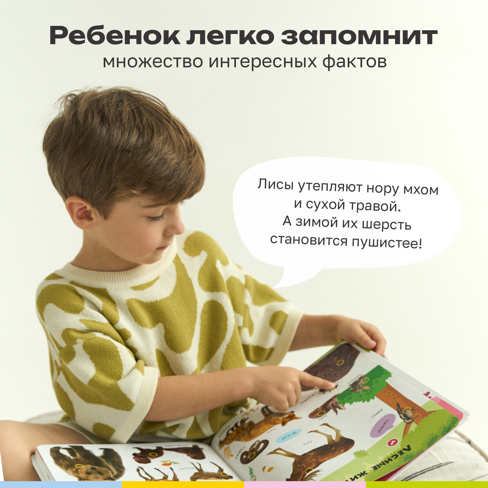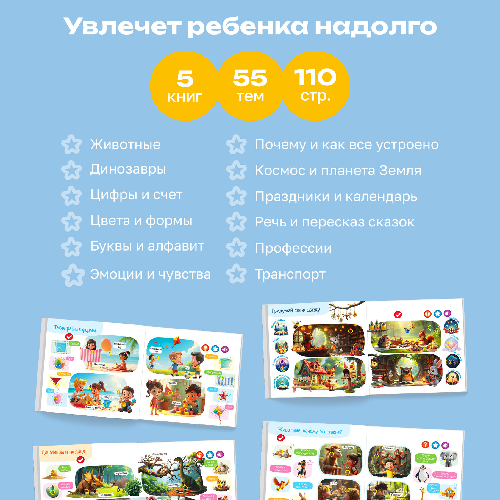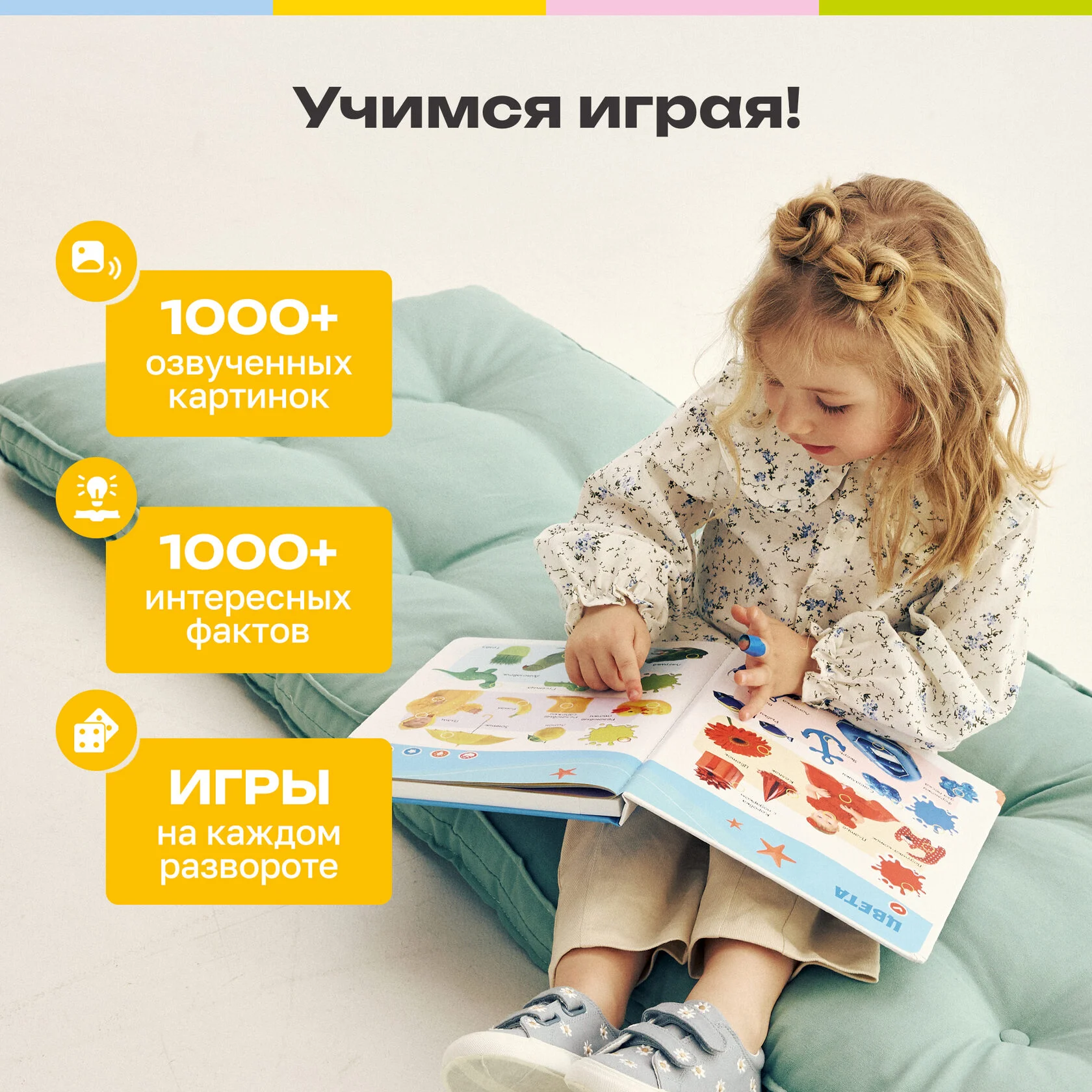 «Почемучки», «Динозавры», «Животные», «Первые знания» и «Развитие речи» – более 2500 звуков, фраз, вопросов и 55 обучающих тем! Для каждой тематики предусмотрен свой уникальный режим, который поможет малышу запомнить новые названия, развивать внимание, усидчивость и связную речь.