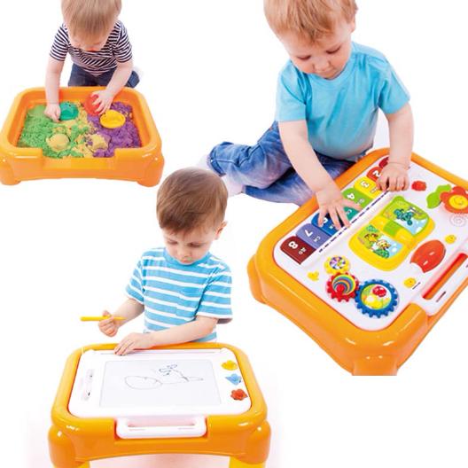 Малышу будет интересно крутить яркие цветные шестеренки или нажимать на клавиши. Он познакомится с цветами и нотами и сможет попробовать сам наиграть мелодию. Также можно выучить веселую песенку, научиться танцевать и послушать про приключения героев интерактивной книжки. Рисуя на магнитной доске, которая находится на обратной стороне игровой панели, ребенок будет развивать свои художественные таланты. Если насыпать кинетический песок, то столик превратится в домашнюю песочницу. Эта игрушка надолго займет малыша.