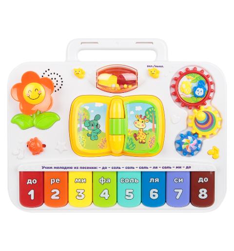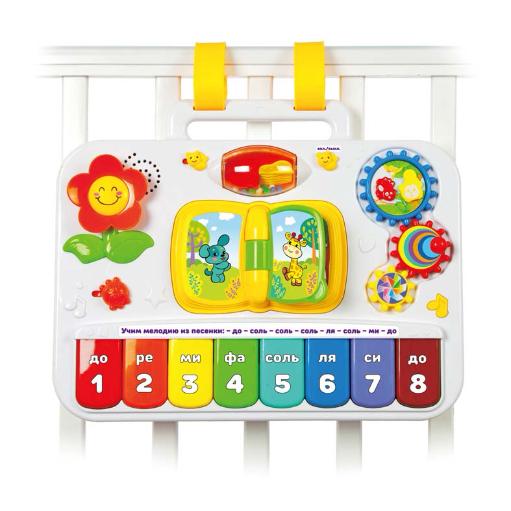 - Подвесная музыкальная игрушка для детской кроватки. Ее игровое табло включает в себя множество интерактивных элементов, например, вращающиеся цветные шестеренки, перелистывающиеся странички книги с животными, цветочек, лопасти с маленькими цветными шариками и пианино. Пианино состоит из 1 октавы, включающей в себя 8 нот, каждая из которых подписана и окрашена в свой цвет. Кроме того, над клавиатурой имеется подсказка, позволяющая разучить несложную мелодию. Игрушка просто фиксируется на стенке детской кроватки с помощью специальных креплений. Такой вариант использования подходит малышам от 6 месяцев.