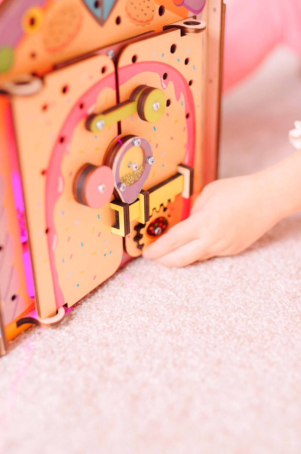 Милый бизидомик для маленьких девочек сладкоежек. Сделан согласно методике Монтессори. На домике закреплено 15 разных элементов для развития мелкой моторики, координации движений, логики и воображения.