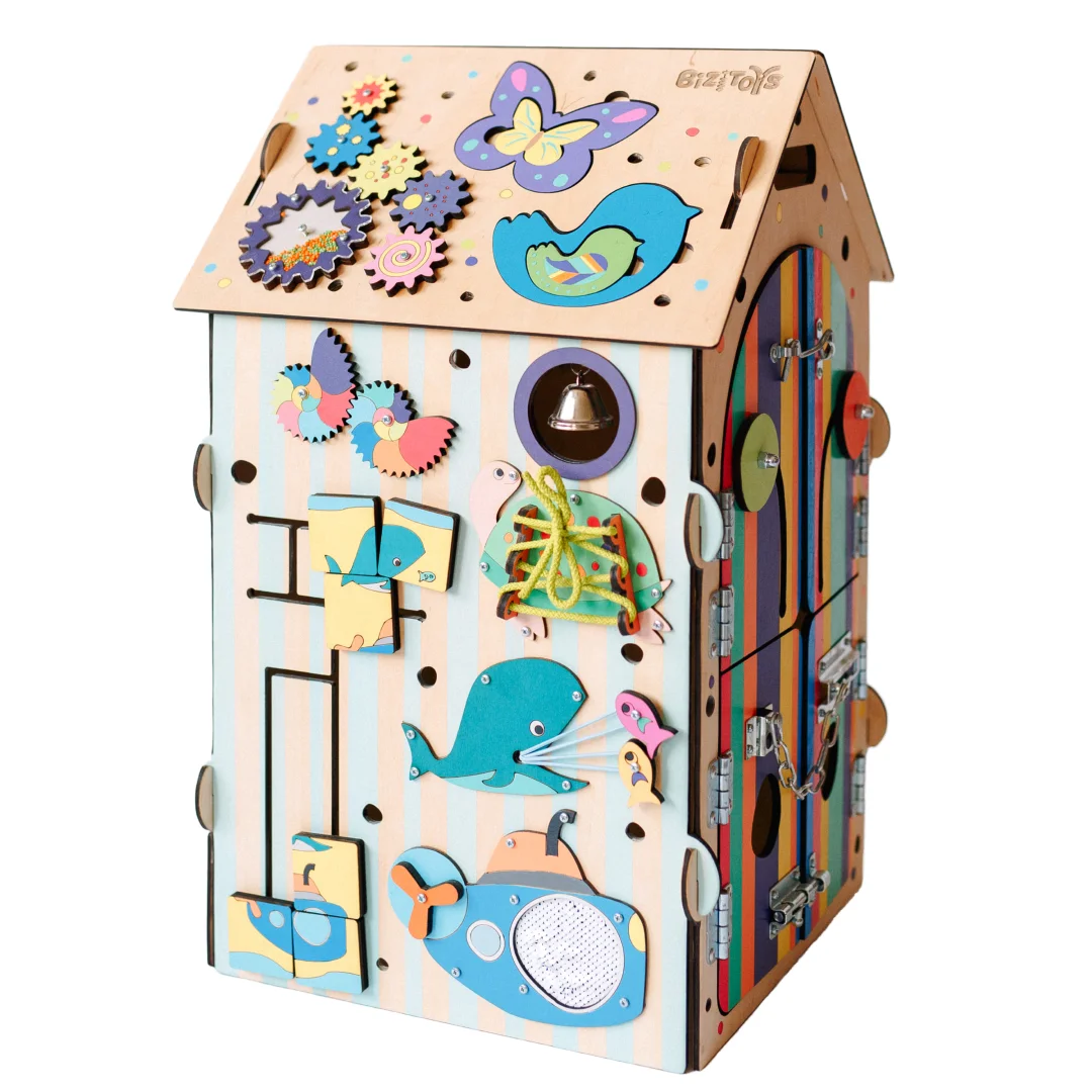 Сторона Г: Дверка с такими любимыми ключиками - научись открывать ее и узнай кто прячется за дверкой! По веселому сказочному дереву скатываются монетки - запускай сверху и лови их снизу! Светильник, который зажигается при нажатии на него! импровизированная розетка, шестерня с ручкой - покрути ее и понаблюдай, как внутри прокручиваются небольшие шестеренки! Бусинки на веревках можно перебирать пальчиками и учить цвета!