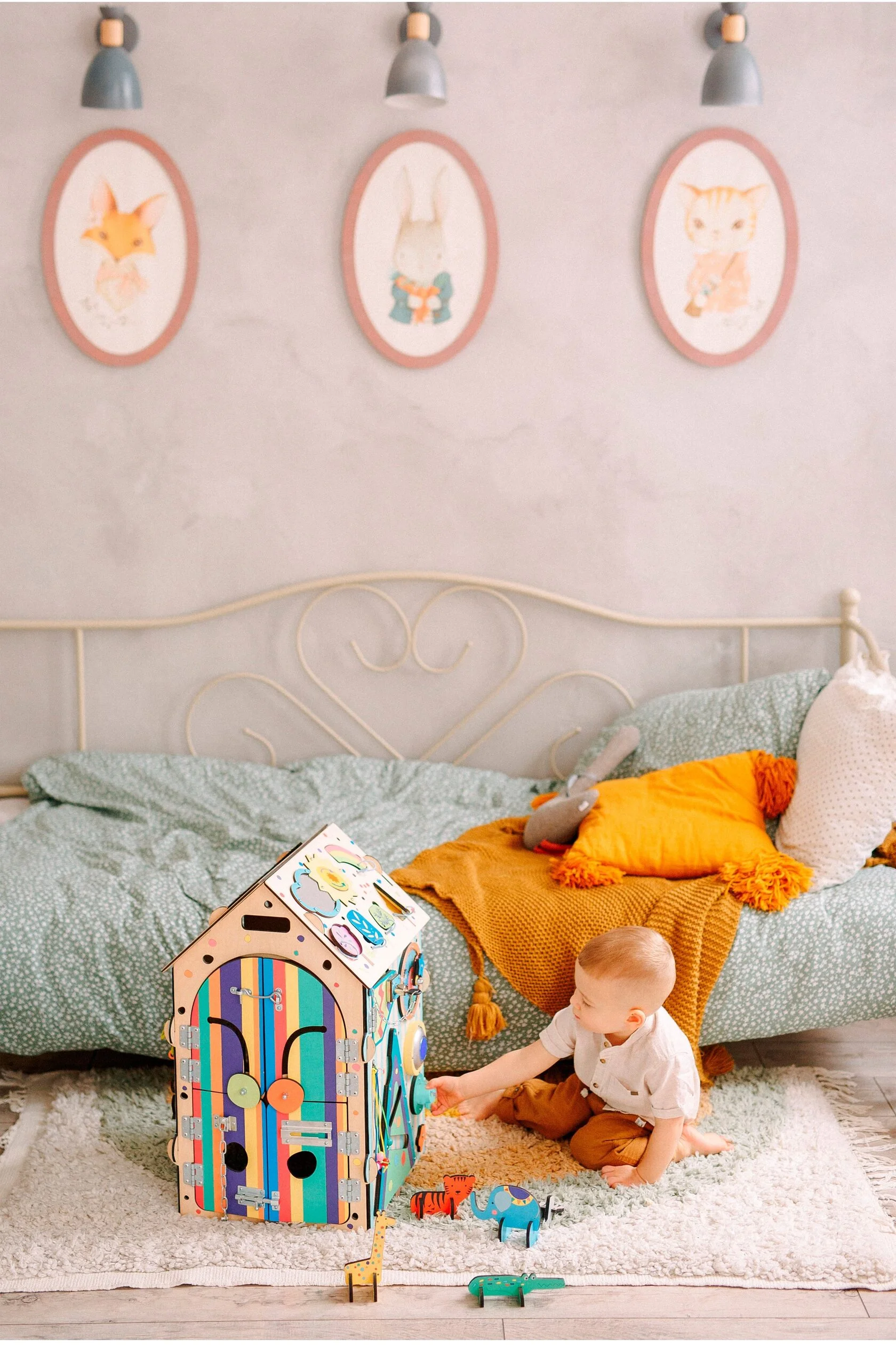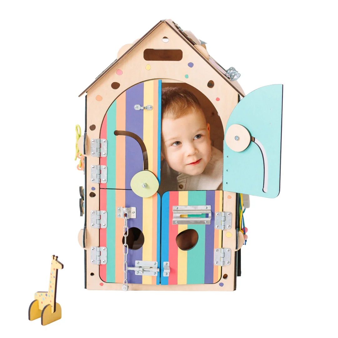 Сторона А: 4 больших дверки с крючком и шпингалетом, дверной цепочкой, которые так нравится открывать деткам. Открыв все дверки, открывается все пространство домика! Малыш может спрятаться внутри домика сам, а также спрятать животных, которые идут в комплекте с домиком и поиграть в импровизированный зоопарк!:)