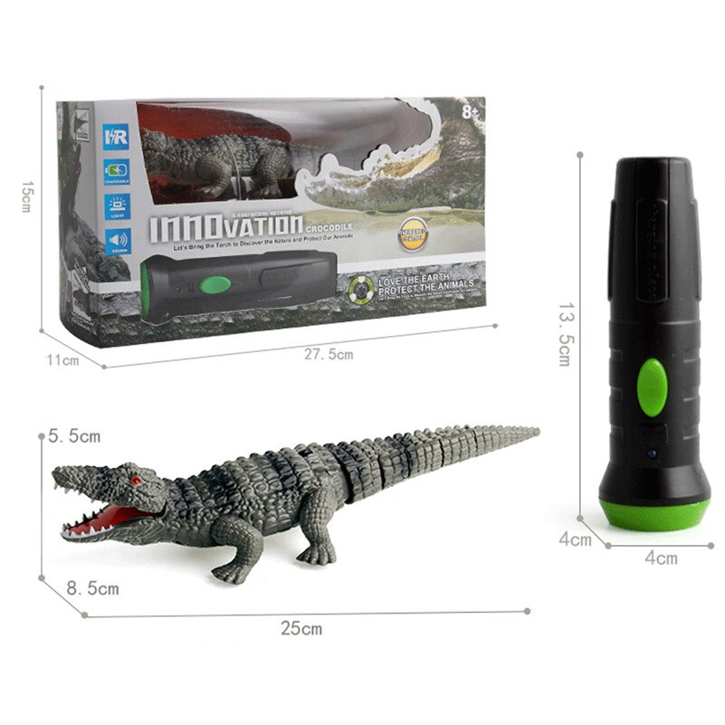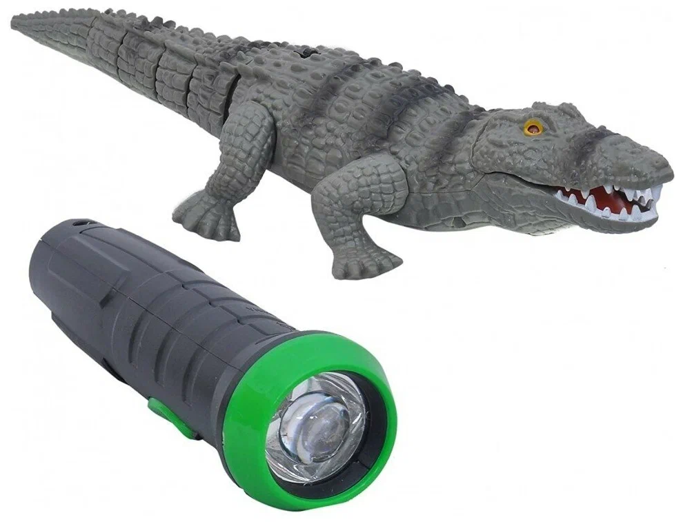 - Обратите внимание на форму пульта дистанционного управления – это зеленый фонарик с функцией включения подсветки и регулированием движений крокодила. Отправьте рептилию в темную комнату, а потом легко обнаружьте ее с помощью яркого «прожектора».