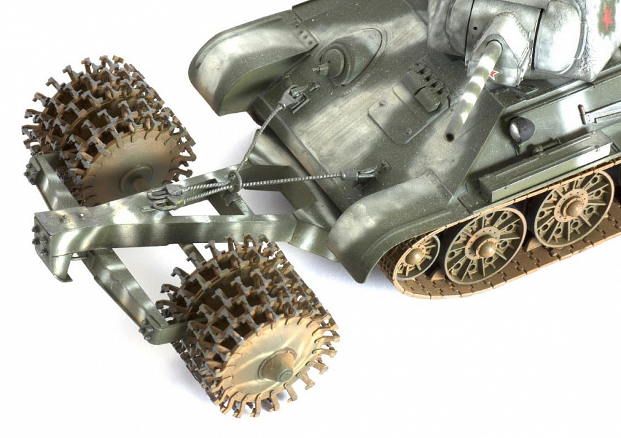 Историческая справка: Борьба с минными заграждениями стала одной из главных проблем при ведении наступления частями Красной Армии. Для этих целей и был разработан минный трал, он устанавливался на танки Т-34 всех модификаций и самоходки на базе “тридцатьчетверок”. Он представлял собой два вала, установленные на вынесенной впереди танка платформе, которая крепилась к броне снизу под местом механика водителя.