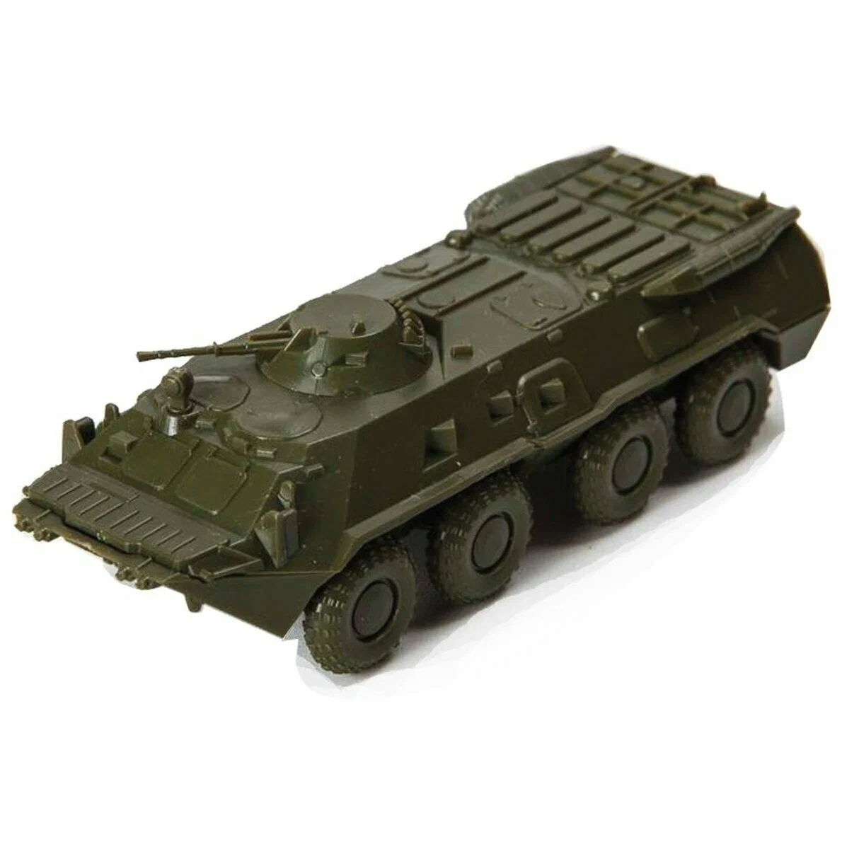 Детализированная конструкция: Модель воспроизводит характерные черты БТР-80: восьмиколесную ходовую часть с независимой подвеской, сварную башню конической формы со спаренной пулеметной установкой, двухстворчатые бортовые двери для десанта и характерные люки в крыше корпуса.