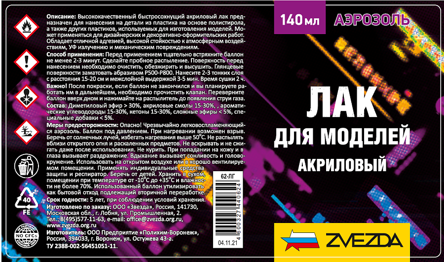 Хотите, чтобы ваша модель сияла и была надежно защищена? Закажите акриловый глянцевый лак-аэрозоль Zvezda 62-ЛГ прямо сейчас! Сделайте финишную отделку быстрой, легкой и профессиональной. Добавьте товар в корзину и завершите свою работу безупречно!