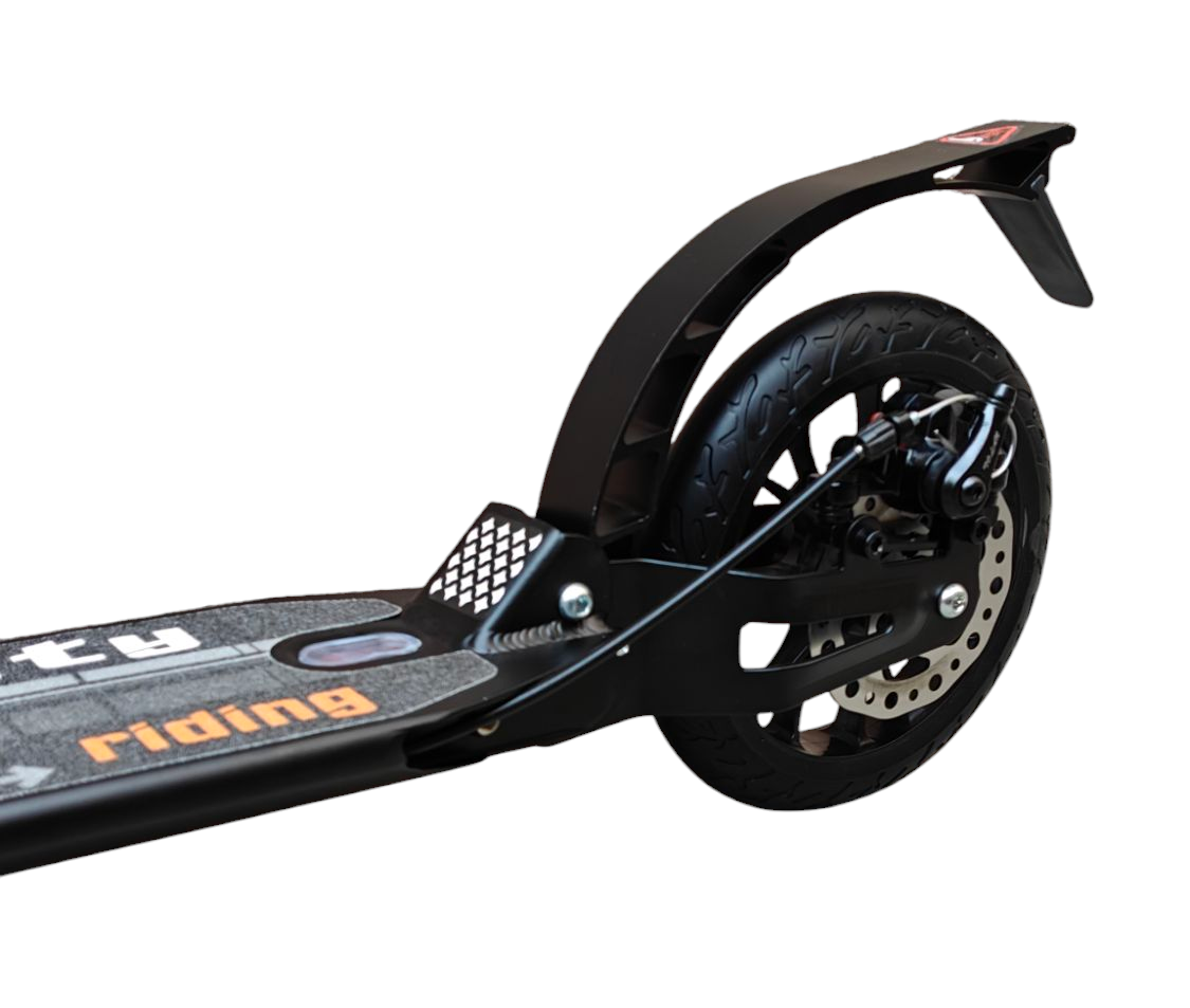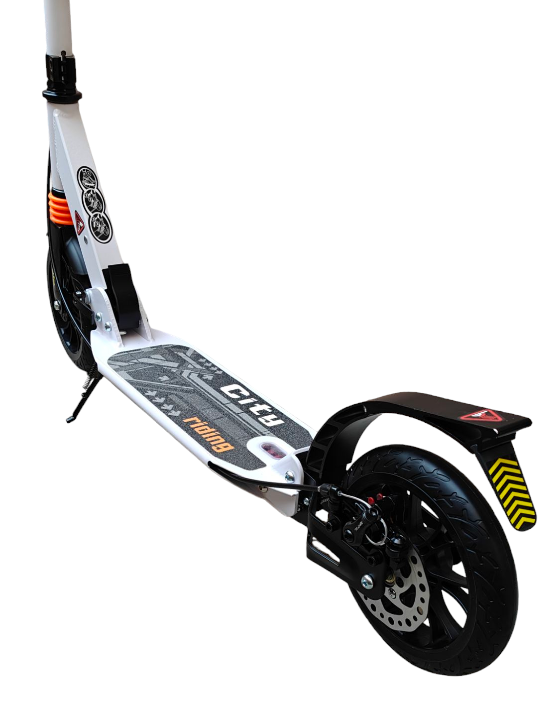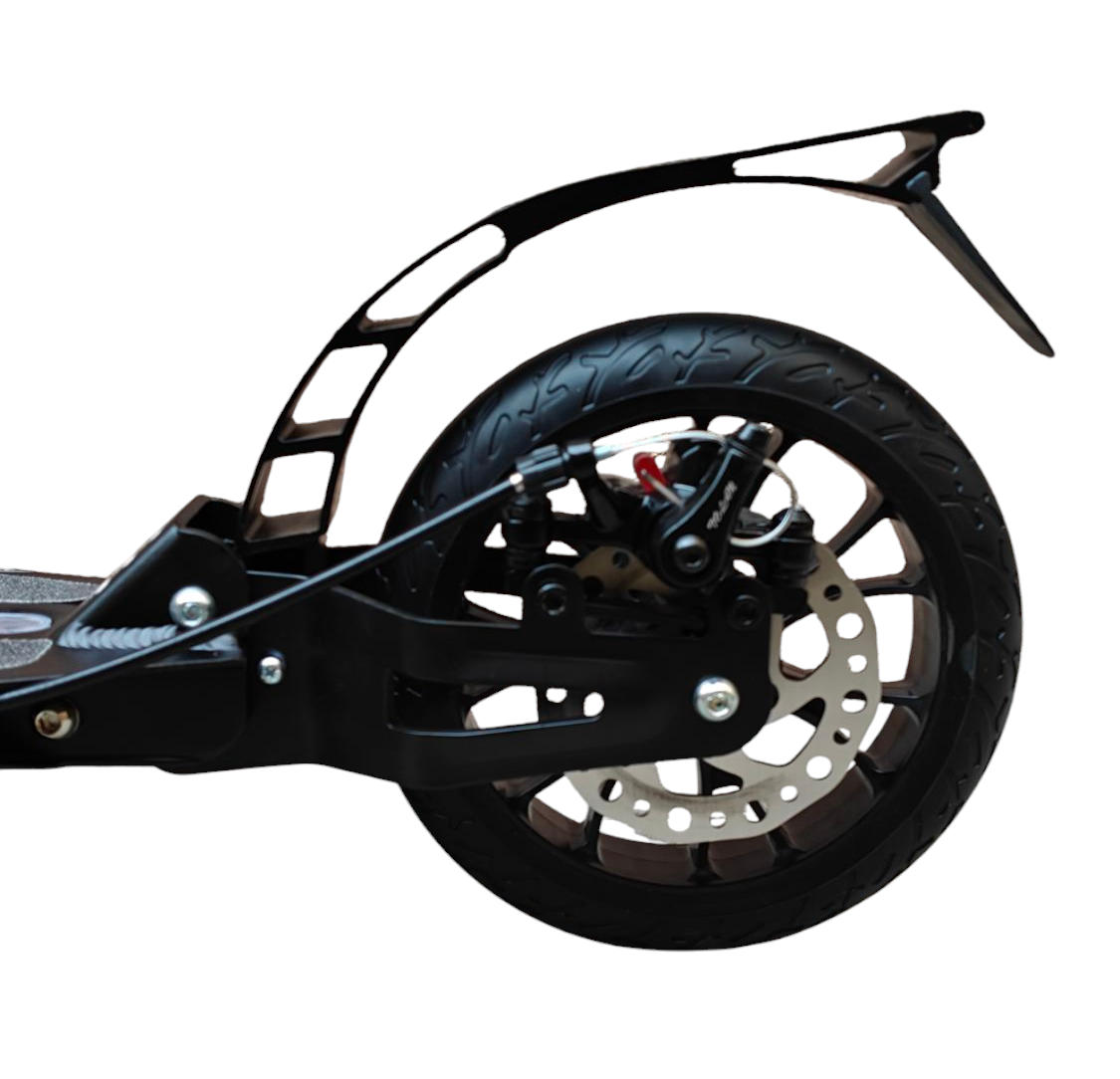 Urban Scooter Disk 116D — это модель с ручным дисковым тормозом, который позволяет эффективно тормозить даже во влажную погоду, когда колёса намокают и становятся скользкими. На заднем колесе закреплён стальной диск и тормозные колодки прижимаются не к самому колесу, а к диску. Колёса более широкие (40 мм). Заднее крыло имеет широкую металлическую накладку для лучше защиты от брызг. Колёса оснащены профессиональными подшипниками 6000RS.