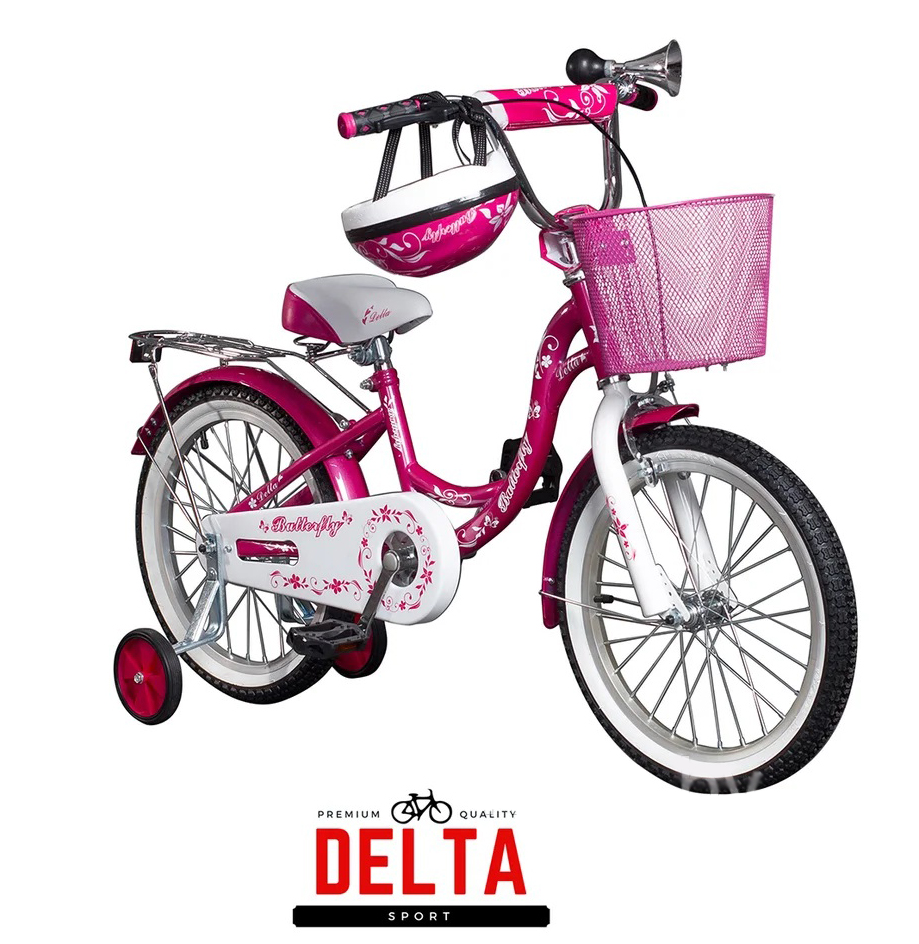 Детский велосипед Delta Butterfly 16" New цвет бело-розовый или розовый с передним ручным V-BRAKE тормозом, шлемом и мягкими светящимися полиуретановыми приставными колесами, мишурой в ручках руля- это велосипед для юных принцесс 4-7 лет.